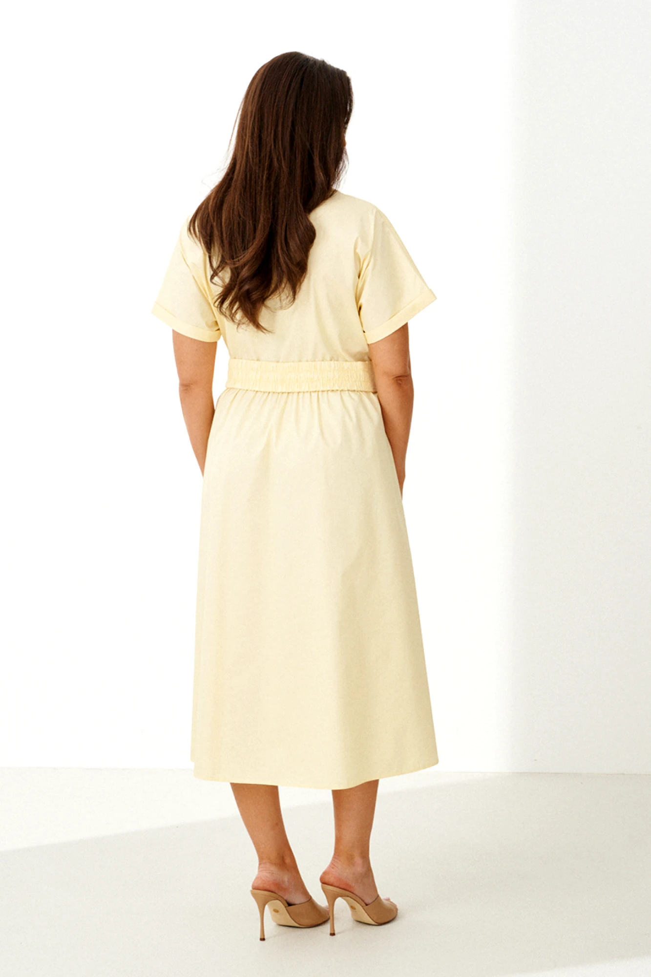 Платье женское из смесовой ткани для повседневной носки. Платье, расширенное к низу, а также отрезное по линии талии и имеет сборку. Перед имеет дизайнерскую вышивку в виде очаровательных цветов, а также две нагрудные вытачки. В боковом шве имеются потайные прорезные карманы. Горловина обработана втачной планкой и стойкой. Рукава цельнокроеные, низ рукава обработан отлетной манжетой, длинна рукава чуть выше локтя. Длинна платья макси. Для придания формы в области талии имеется пояс из основной ткани с застежкой на кнопки. В платье имеются по планке декоративные закрепки. Платье нежного светло-жёлтого цвета, в котором вы будете выглядеть очень привлекательно. За счет большого содержания хлопка в платье, ваша кожа будет чувствовать себя комфортно. Красивое и элегантное платье в котором вы будете выглядеть неотразимо.