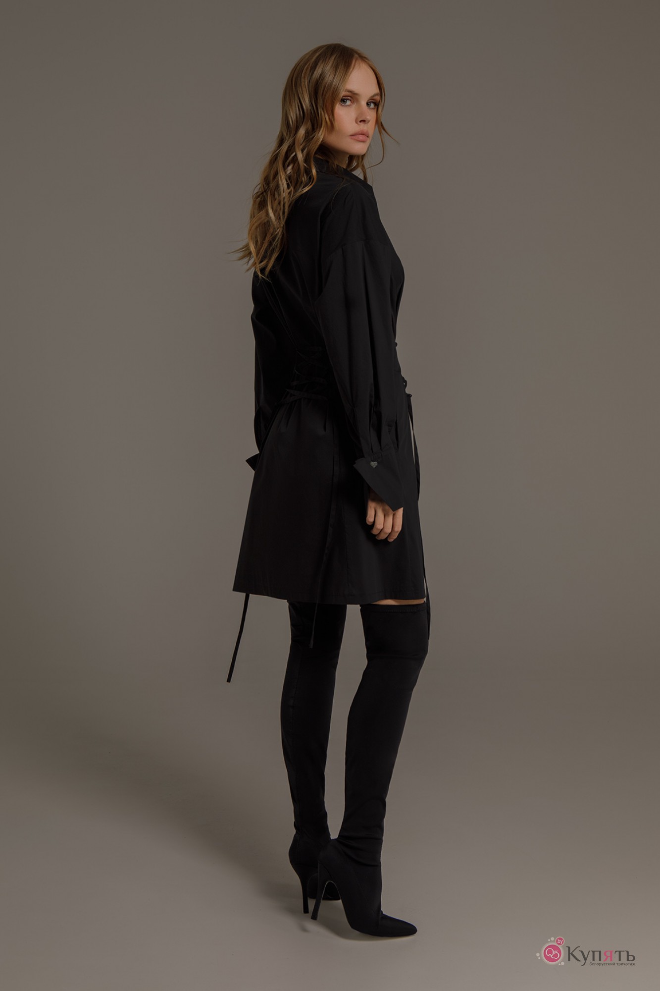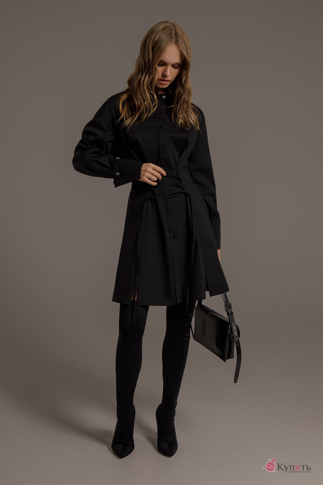 Хлопковое платье-рубашка с декоративной шнуровкой по талии. Детали: свободный силуэт, спущенная линия плеча, рубашечный воротник, рельефные швы переда и спинки, рукава длинные с высокими манжетами, боковые карманы