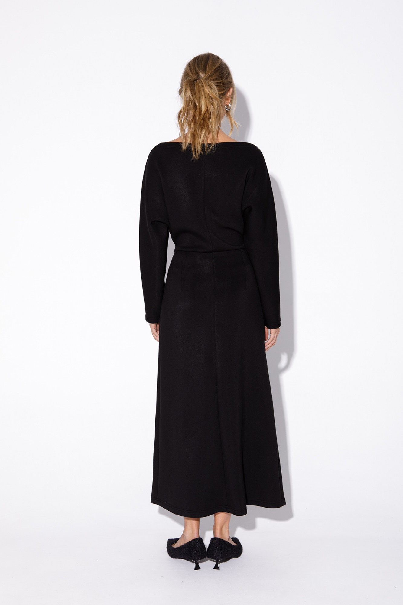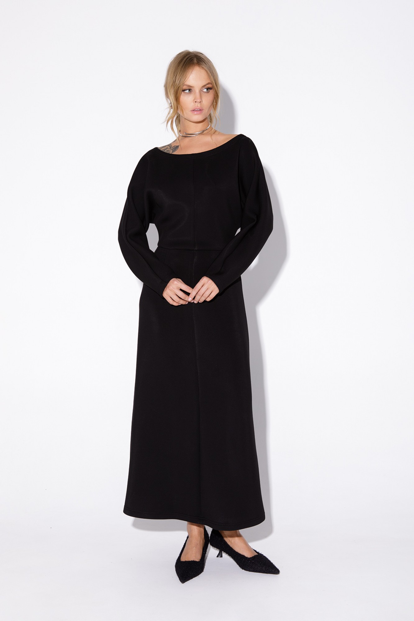 Миди-платье из мягкого трикотажа. Детали: широкий вырез горловины переда и спинки, талиевые вытачки, отрезная линия талии с резинкой, цельнокроеные свободные рукава, без застежки