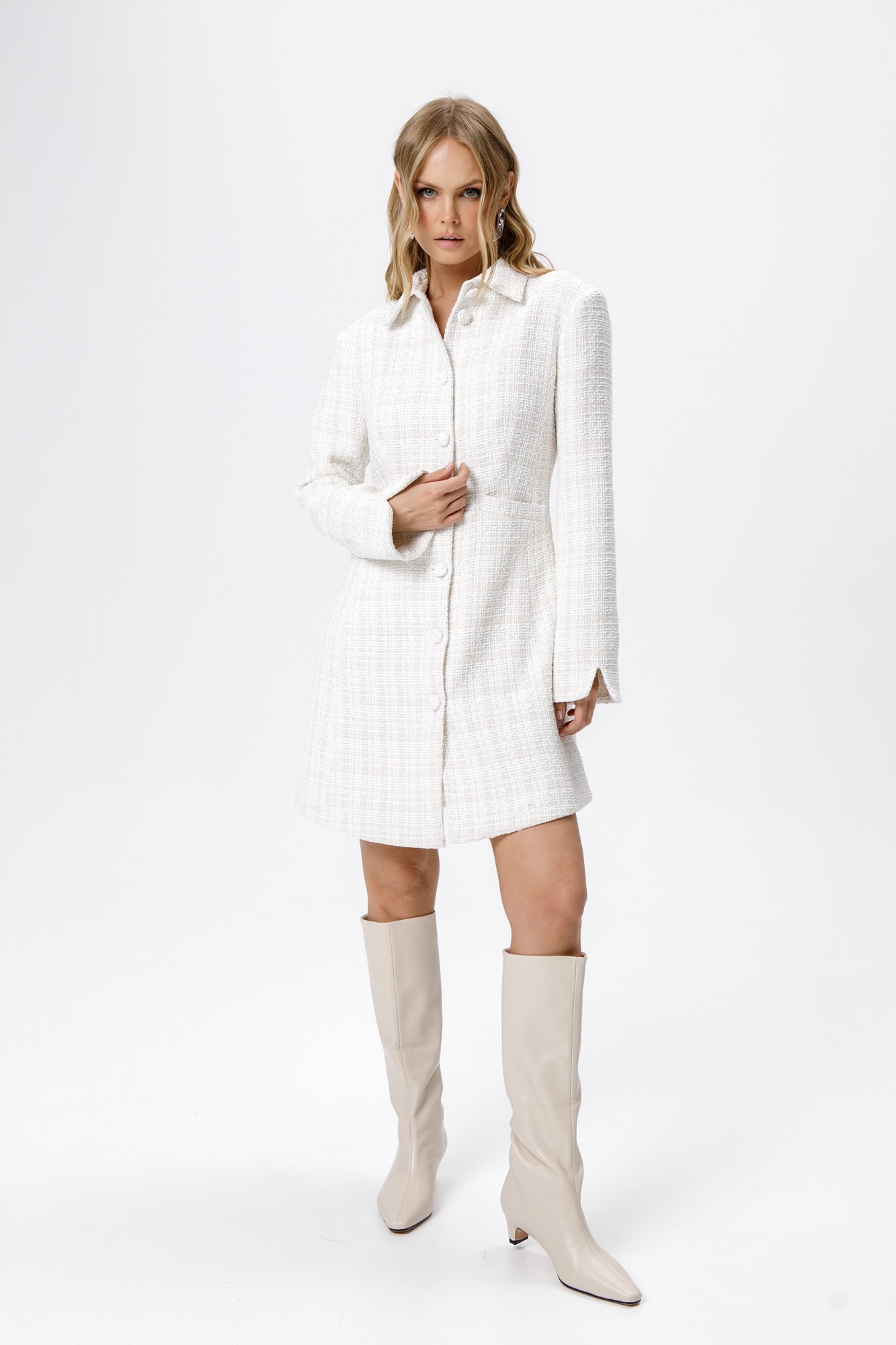 Приталенное платье из фактурной ткани. Детали: полуприлегающий силуэт, перед с функциональными карманами, однобортная застежка на петли и пуговицы, фигурный низ, рукава втачные с разрезами по низу, платье на подкладке.