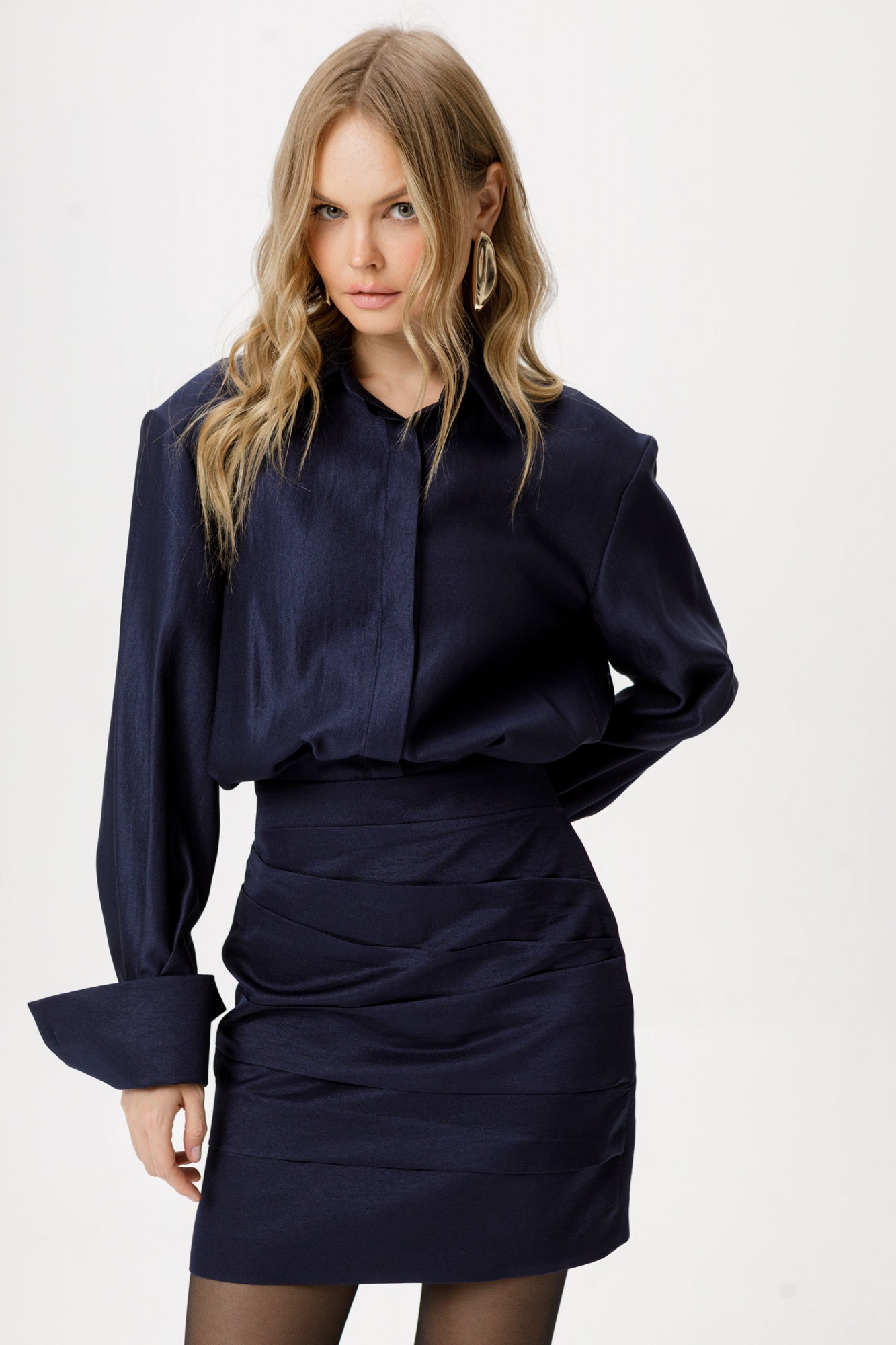 Платье-рубашка длины мини. Детали: платье полуприлегающего силуэта, отрезное по талии с напуском, нижняя часть переда с ассиметричными складками, нижняя часть спинки с талиевыми вытачками, верхняя часть платья со складками на талии, рубашечный воротник, застёжка на потайную планку с пуговицами, потайная молния в боковом шве, рубашечный покрой рукава с расширенным плечом, широкие манжеты. Юбка платья на подкладке.