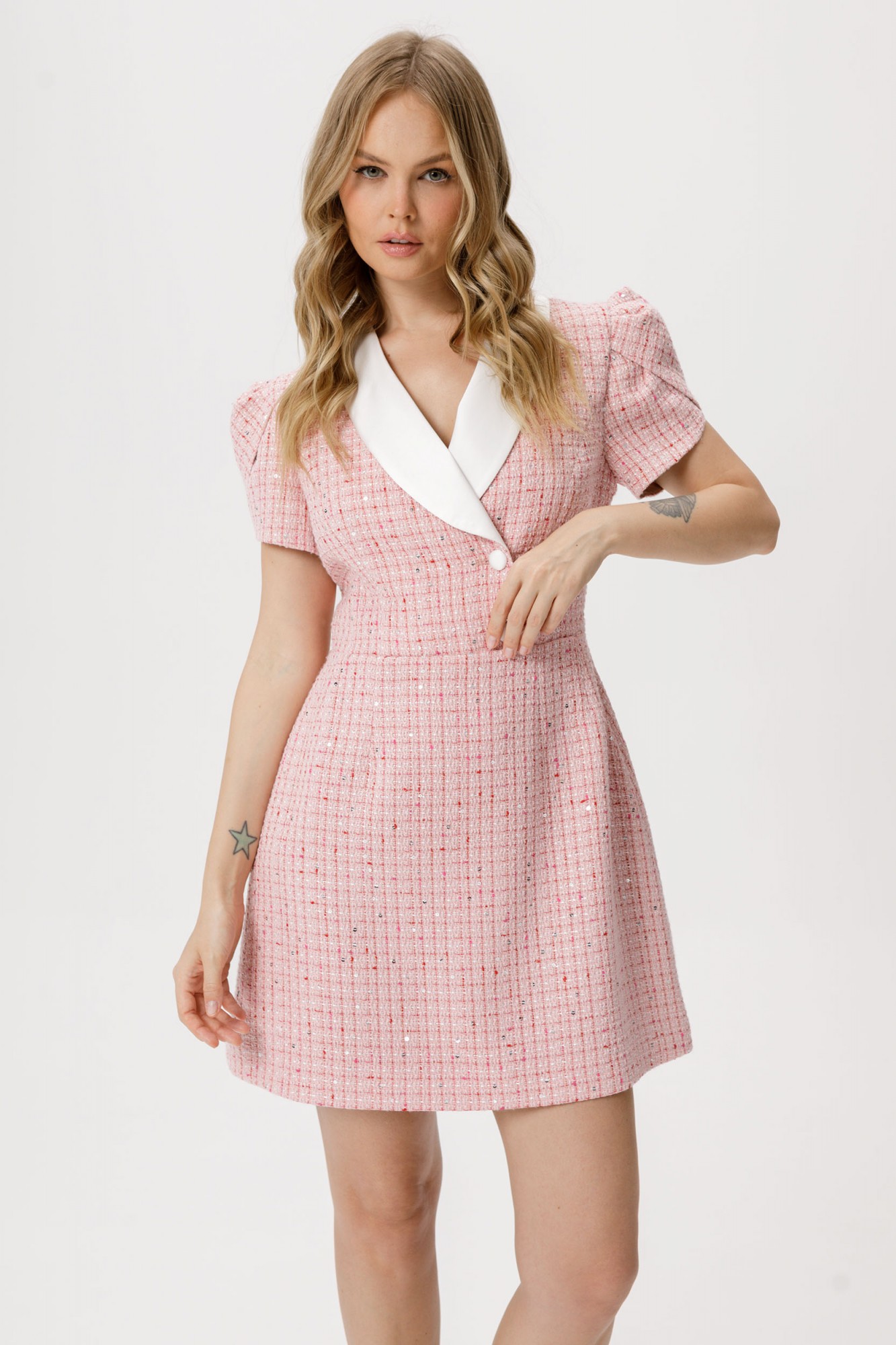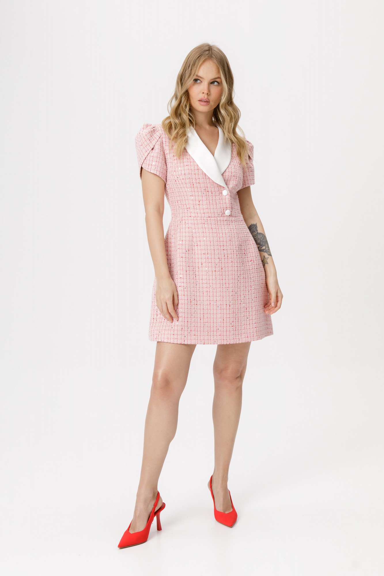 Мини платье из фактурной ткани с рукавом «фонариком». Детали: платье полуприлегающего силуэта, перед с рельефами и имитацией запаха с застежкой на две петли и пуговицы, спинка со средним швом и талиевыми вытачками, рукава втачные с запахом и бантовыми складками, шалевый контрастный воротник, платье застёгивается на потайную молнию в левом боковом шве, платье на подкладке.
