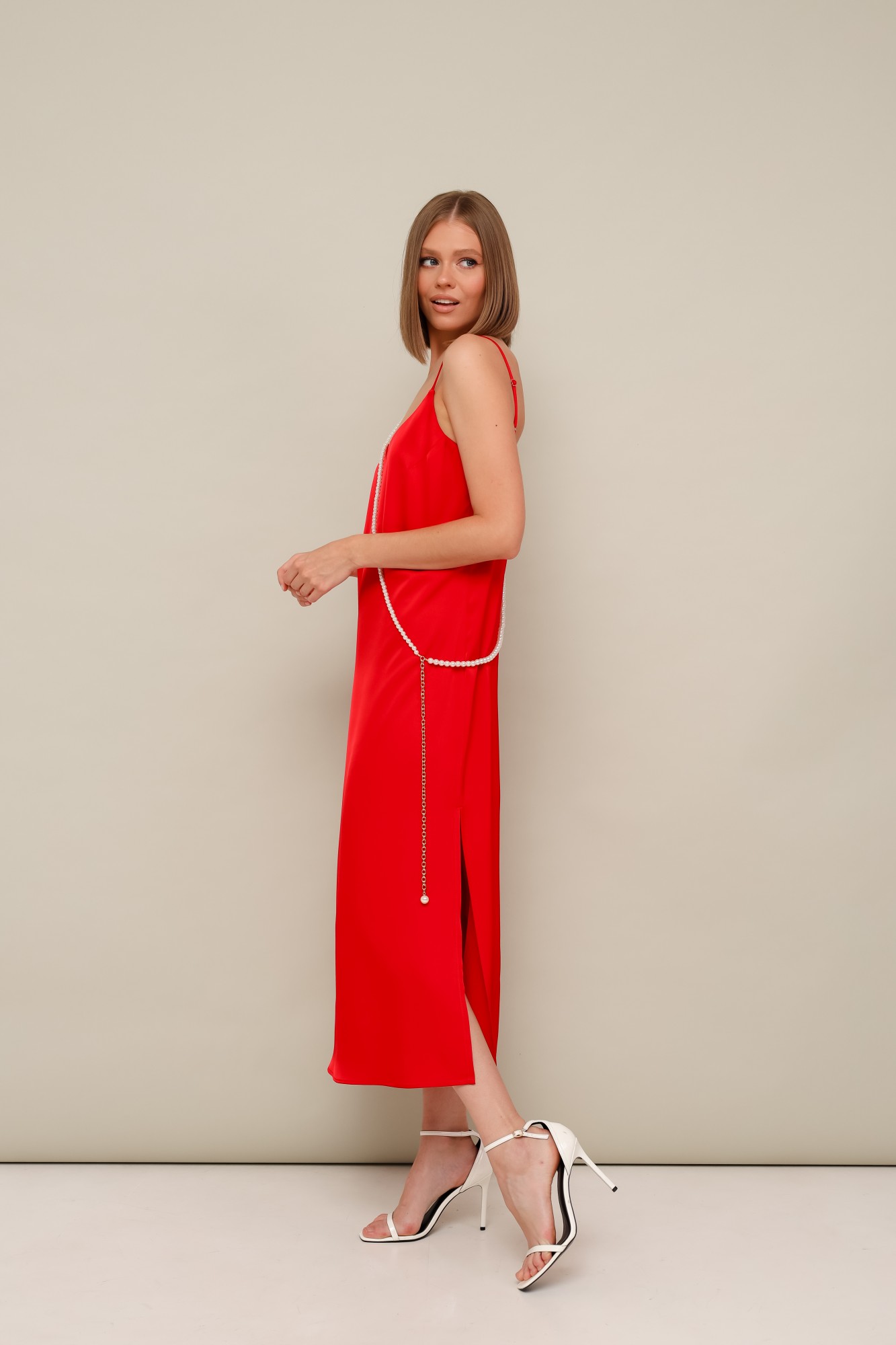 Платье-комбинация полуприлегающего силуэта из струящейся ткани с благородным матовым блеском. Перед с нагрудными вытачками. В боковых швах по низу обработаны высокие разрезы. Бретели регулируются по длине. В комплекте к платью прилагается жемчужная цепочка. Платье без подкладки.