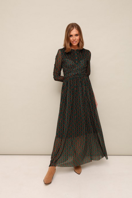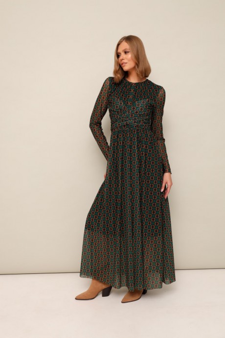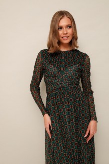 Эффектное платье в длине макси, отрезное по линии талии, выполнено из сетки с дизайном. Округлая форма горловины со сборкой и вырезом в среднем шве. Лиф с фигурным подрезом в области груди и перекрестными драпированными деталями, переходящими на спинку. Рукава длинные втачные. Юбка А –образного силуэта. Застежка по спинке на потайную тесьму молнию. Платье обработано эластичной подкладкой из масла.