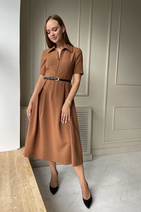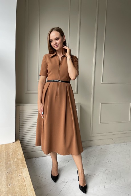 Элегантное платье с отрезной талией, с функционирующей молнией спереди. Ремень в комплекте. Воротник отложной. Материал неплотный, хорошо держит форму.