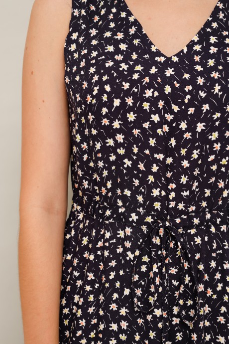 Платье выполнено из натуральной ткани с содержанием вискозы . Горловина V-образной формы. По линии талии надстрочная кулиса с шнуром. В боковых швах обработаны карманы. Платье без подкладки.