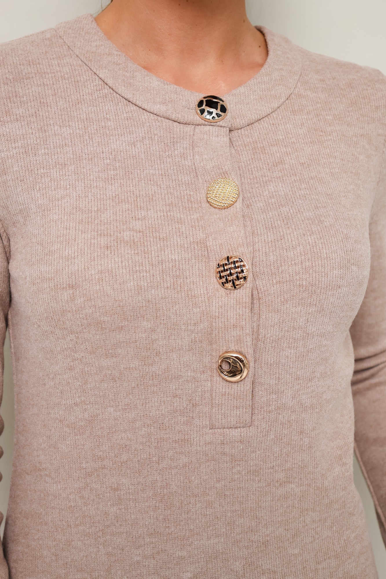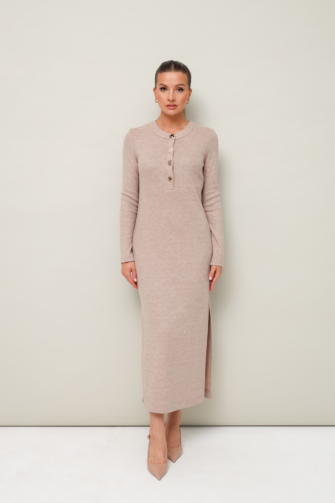 Стильное платье полуприлегающего силуэта, выполнено из трикотажного полотна. Горловина округлой формы, с центральной застежкой на петли и 4 разных пуговицы. Рукава длинные втачные. В боковых швах обработаны высокие разрезы.