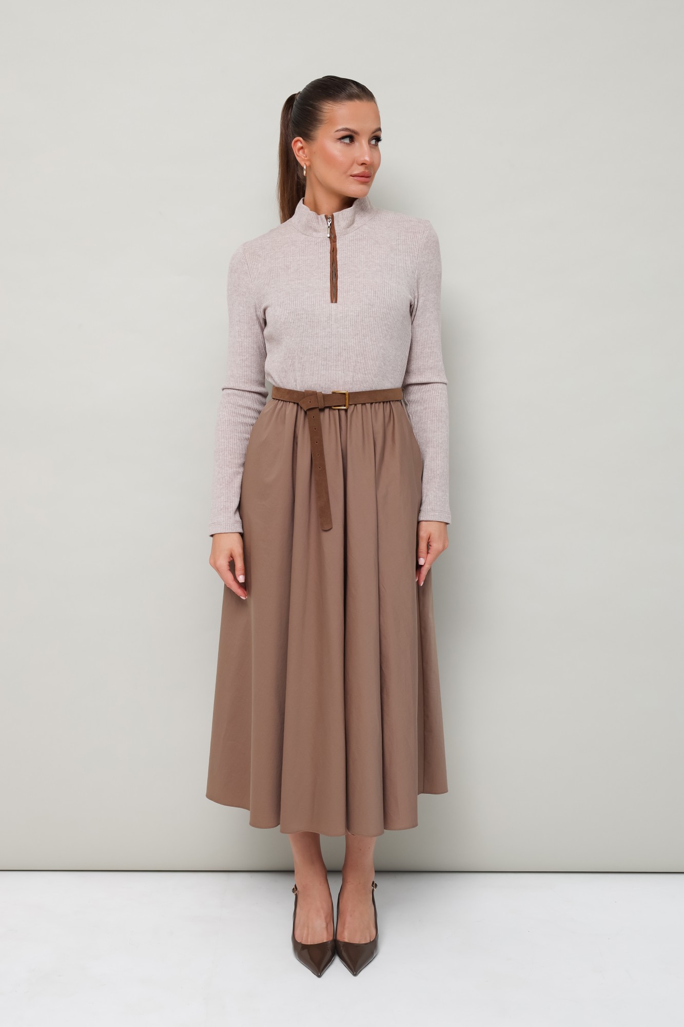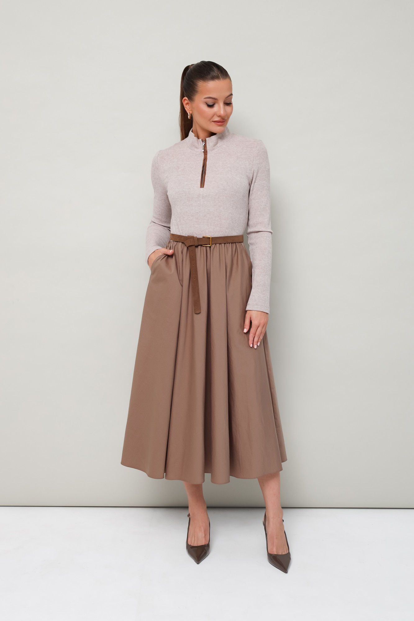 Платье отрезное по линии талии в длине миди. Лиф прилегающего силуэта, выполнен из трикотажного полотна. Горловина с притачным воротником-стойкой. Застежка центральная на тесьму-молнию с притачными планками до линии груди. Рукава втачные длинные. Для комфорта и регуляции размера по талии обработана резинка. Юбка А-силуэта с боковыми наклонными карманами, выполнена из матовой тафты. В комплекте прилагается съемный ремень.