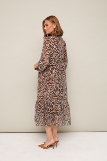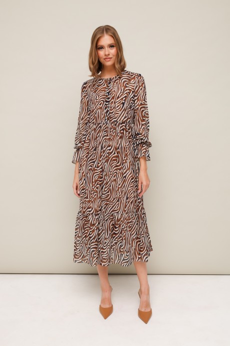 Платье из шифона с абстрактным принтом, отрезное выше линии талии. Горловина округлой формы. Лиф платья с застежкой на притачные планки с петлями и пуговицами. Нижняя часть платья с притачным воланом со сборкой. Рукава длинные втачные на резинке в области запястья. В комплекте прилагается нижнее платье-комбинация на регулируемых бретелях