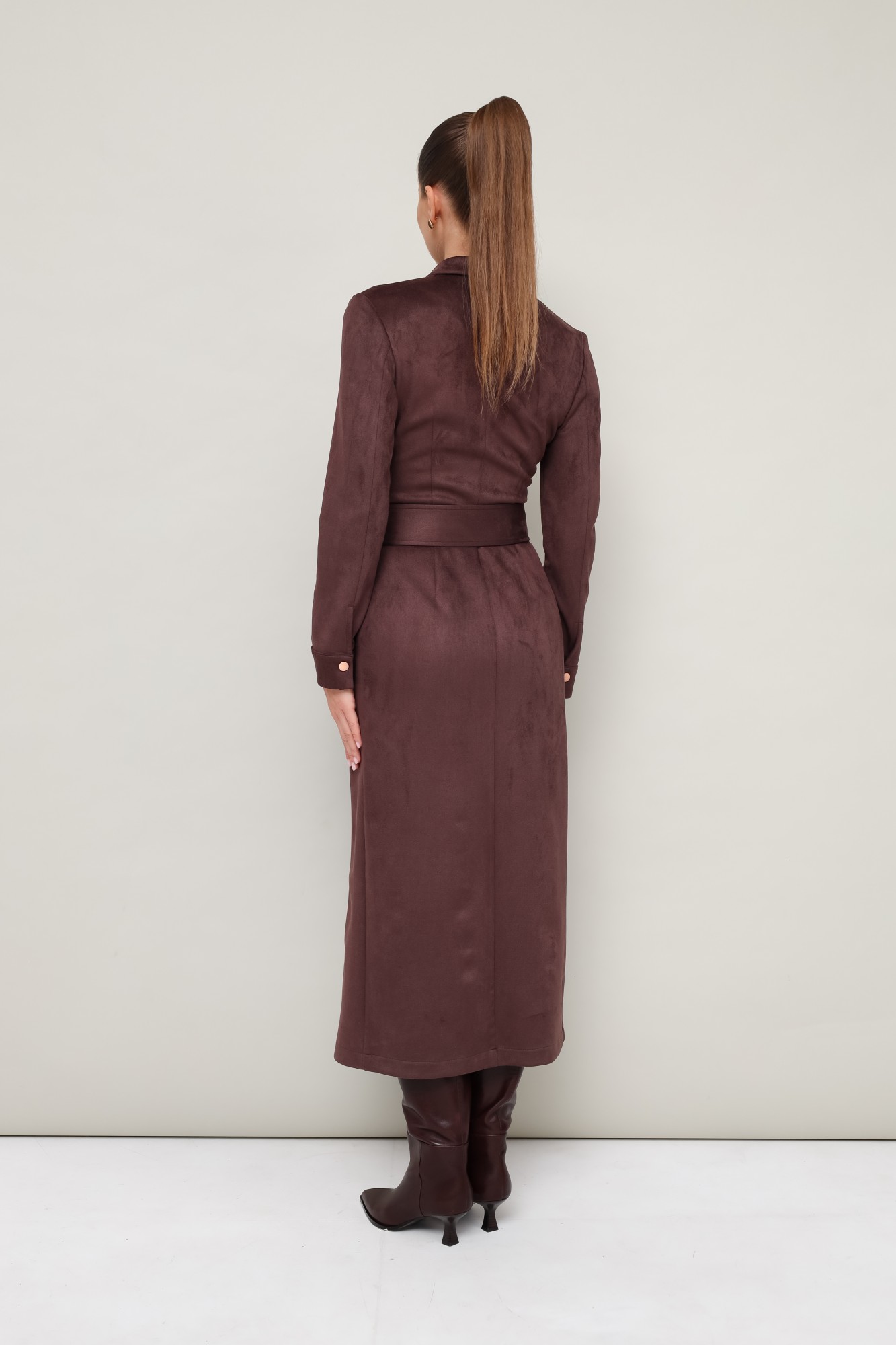 Силуэтное платье в длине миди, выполнено из экозамши. Отложной воротник с цельнокроеной стойкой. Центральная застёжка на кнопки. Перед с рельефными швами. Втачные двухшовные рукава с манжетами с застежкой на кнопки. Спинка со средним швом. В комплекте прилагается пояс из основной ткани с пряжкой.