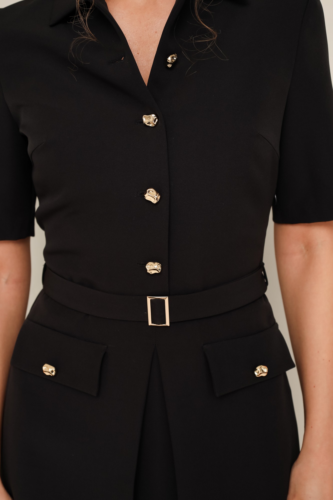 Платье отрезное по линии талии, выполнено из плательной ткани. Горловина с отложным воротником. Лиф с центральной застёжкой на петли и пуговицы. Втачные короткие рукава. Юбка А-образного силуэта, с центральной встречной складкой и с накладными клапанами с пуговицами. В комплекте съемный пояс с пряжкой. По талии предусмотрены шлевки.