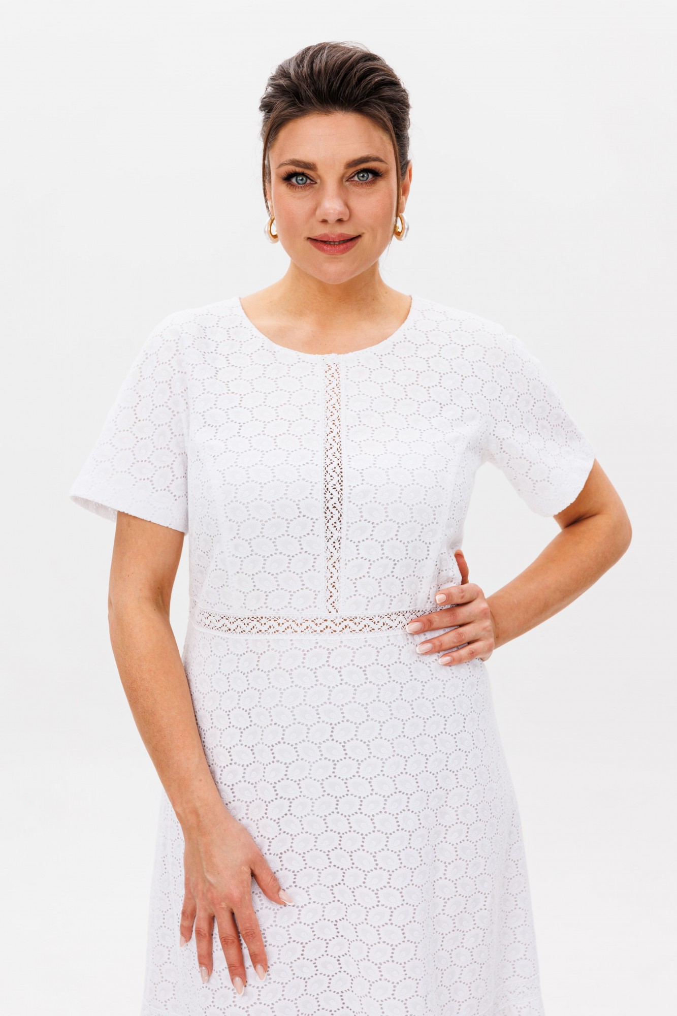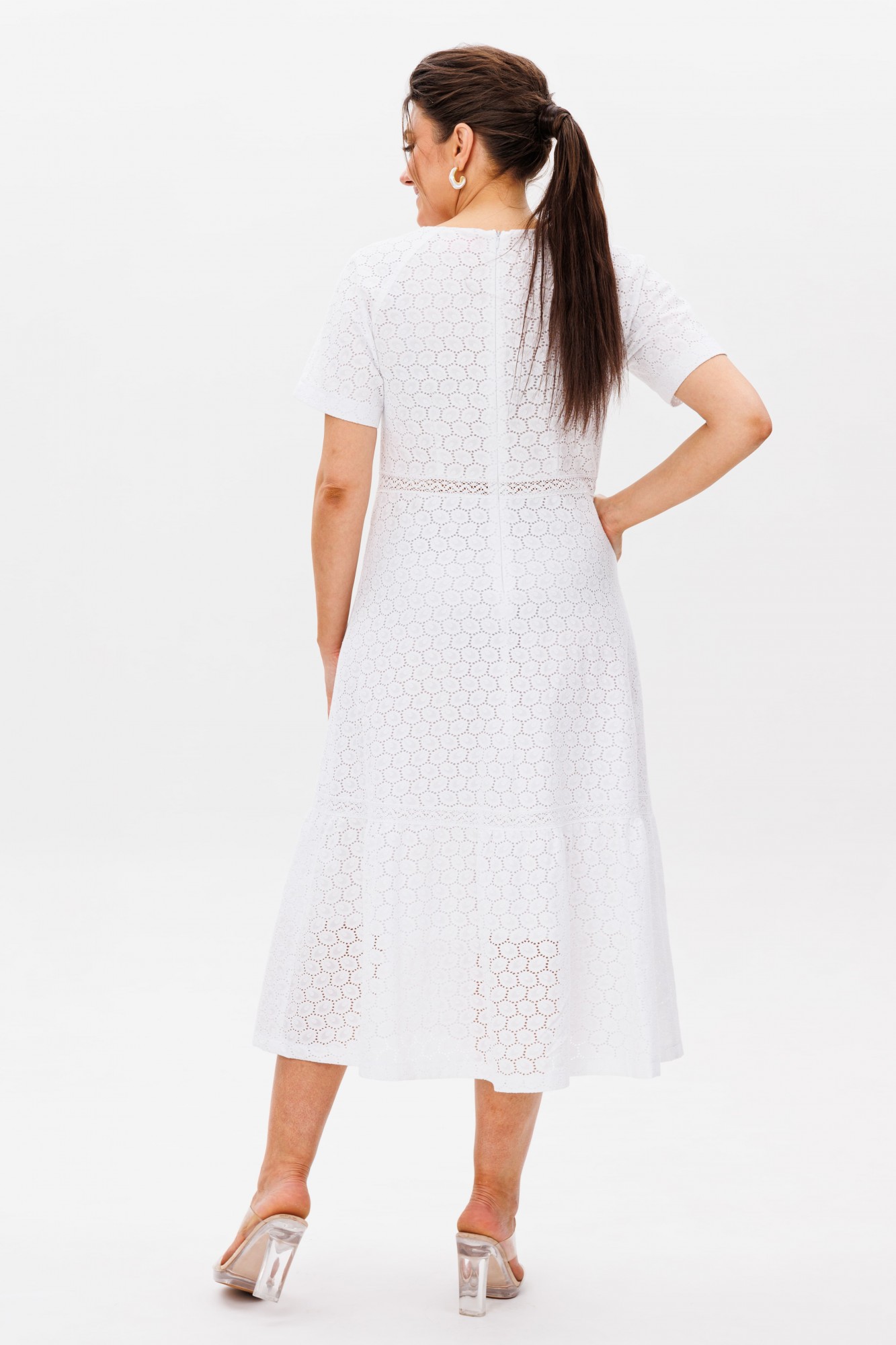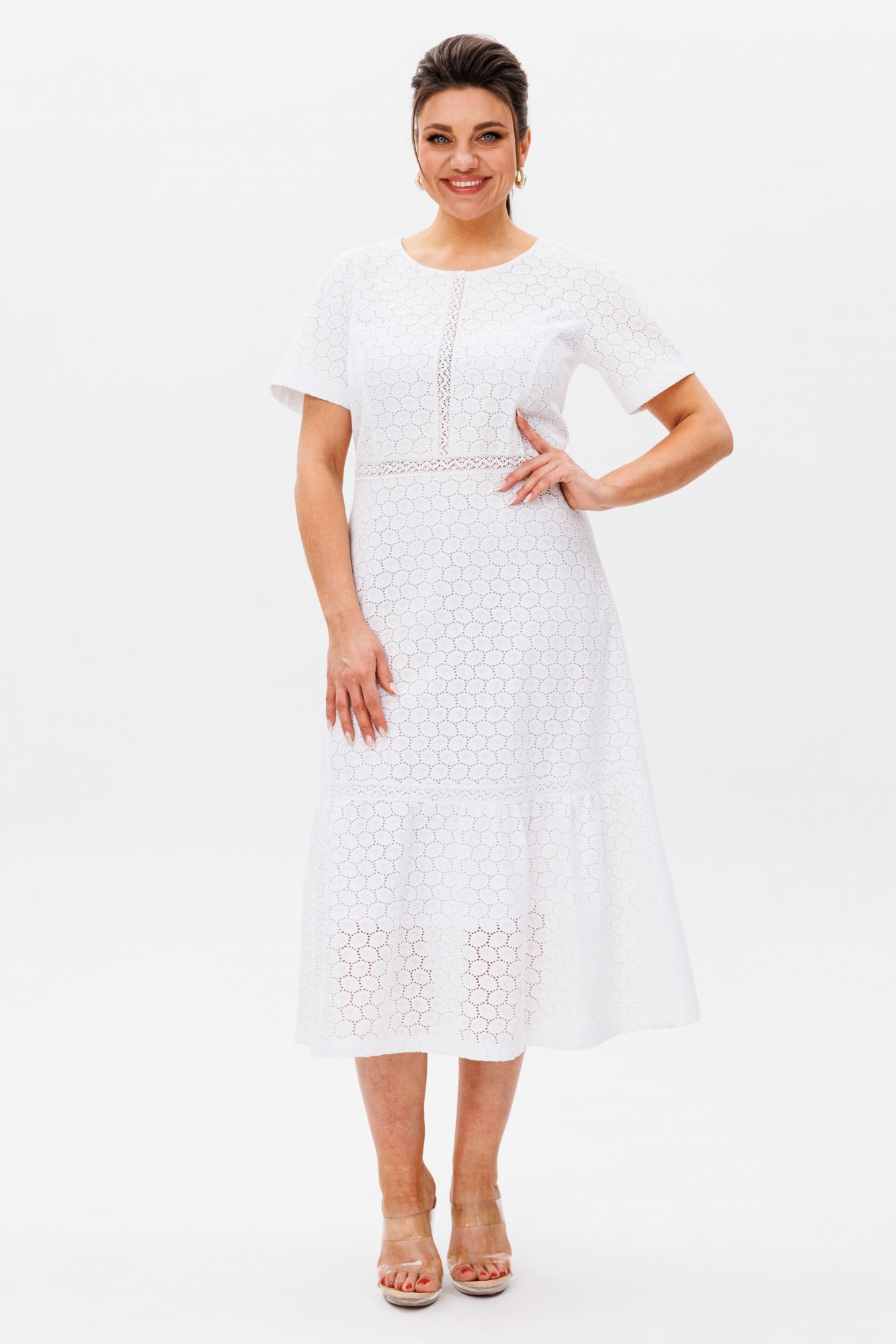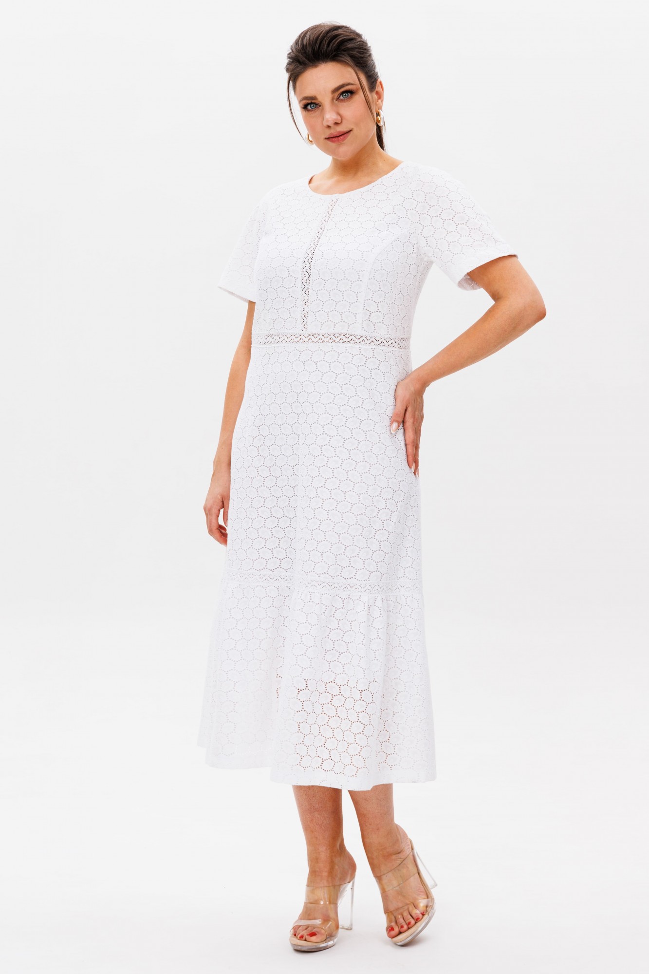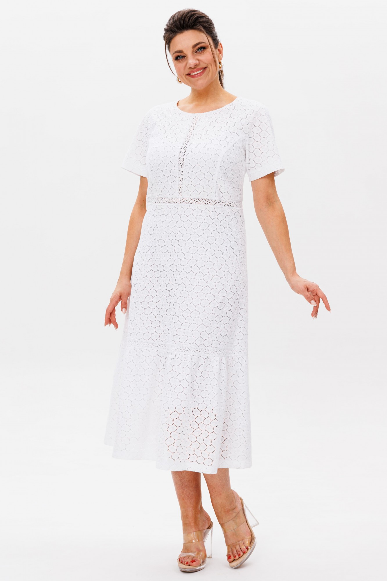 В этом платье словно воплотилась сама нежность — струящийся полуприлегающий силуэт мягко обволакивает фигуру, подчеркивая изящество линий. Круглый вырез горловины, скромный и элегантный, обрамляет лицо, даря ощущение легкости и чистоты. Короткий рукав-реглан, словно вторящий естественным изгибам плеч, добавляет образу воздушности. Застёжка-молния, скрытая на спинке, делает платье удобным, сохраняя при этом безупречную гладкость силуэта. Слегка завышенная талия визуально удлиняет стройность, а воланы по подолу, трепещущие при каждом движении, наполняют образ лёгкой динамикой. Но главное очарование — в кружеве ришелье. Ажурные узоры, словно сотканные из солнечных бликов на белоснежных лепестках, придают платью неповторимый шарм. Подкладка бережно скрывает прозрачность кружева, оставляя лишь его нежное мерцание. Это платье от Анелли — как утренний свет в саду, как первый цветок, раскрывающийся навстречу лету. Оно создано для тех, кто хочет почувствовать себя лёгкой, женственной и в то же время изысканной, словно героиня романтической истории. Рост модели 173 см, размер 52. Для того чтобы подобрать для себя идеальный размер, обязательно сверяйтесь с замерами в описании, мы их делаем индивидуально к каждому изделию.