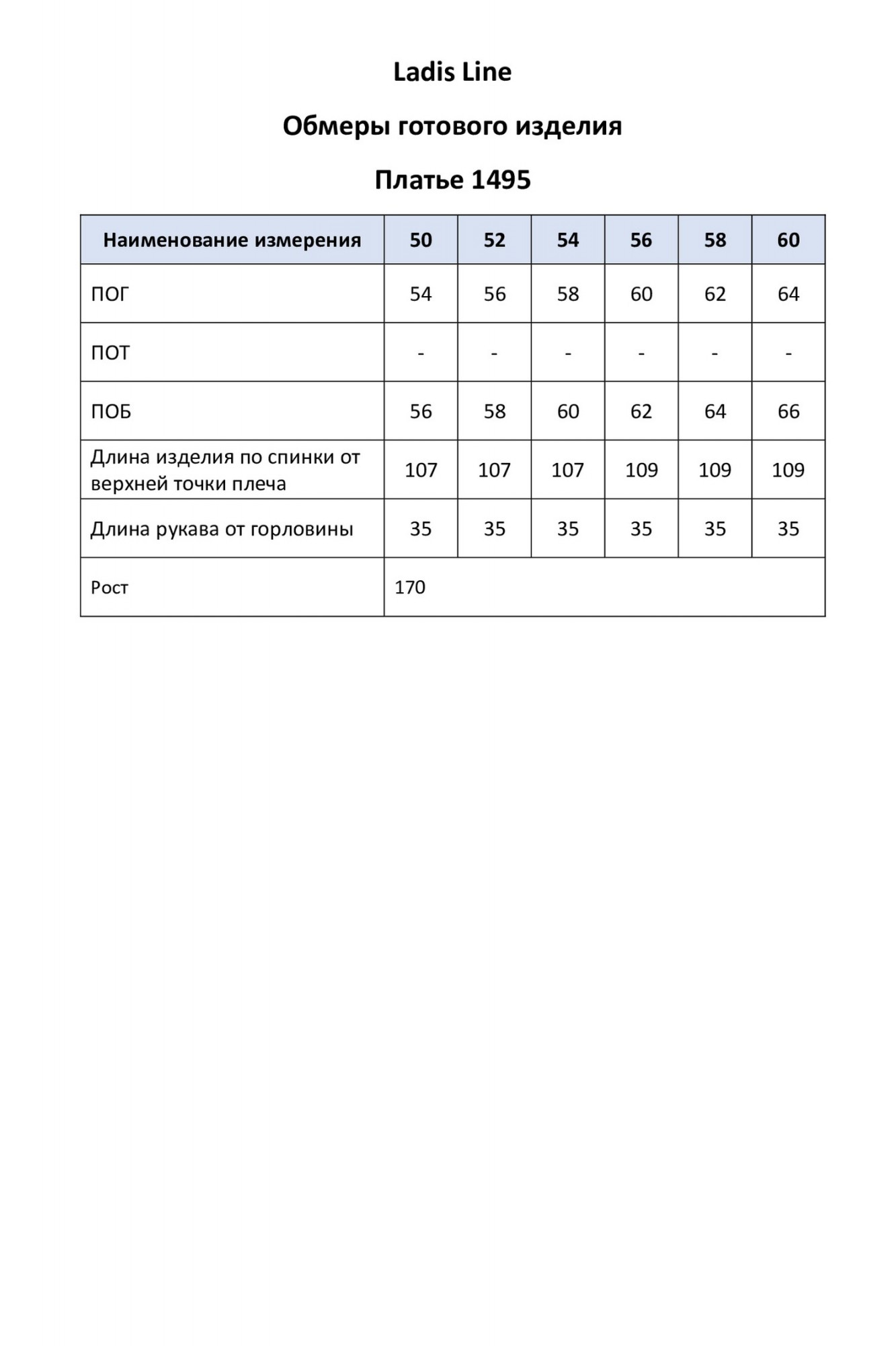 Таблица измерений