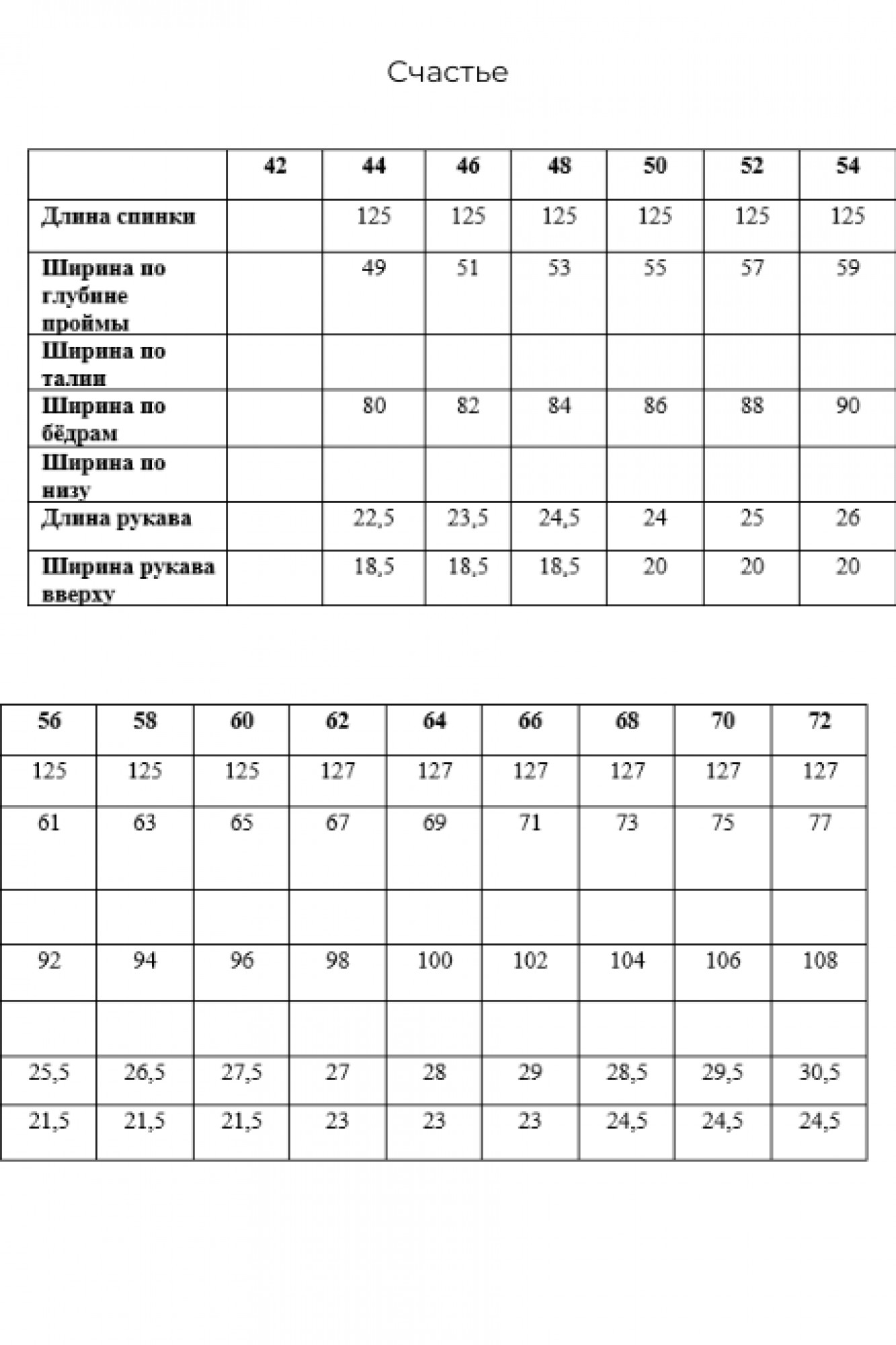 Таблица размеров