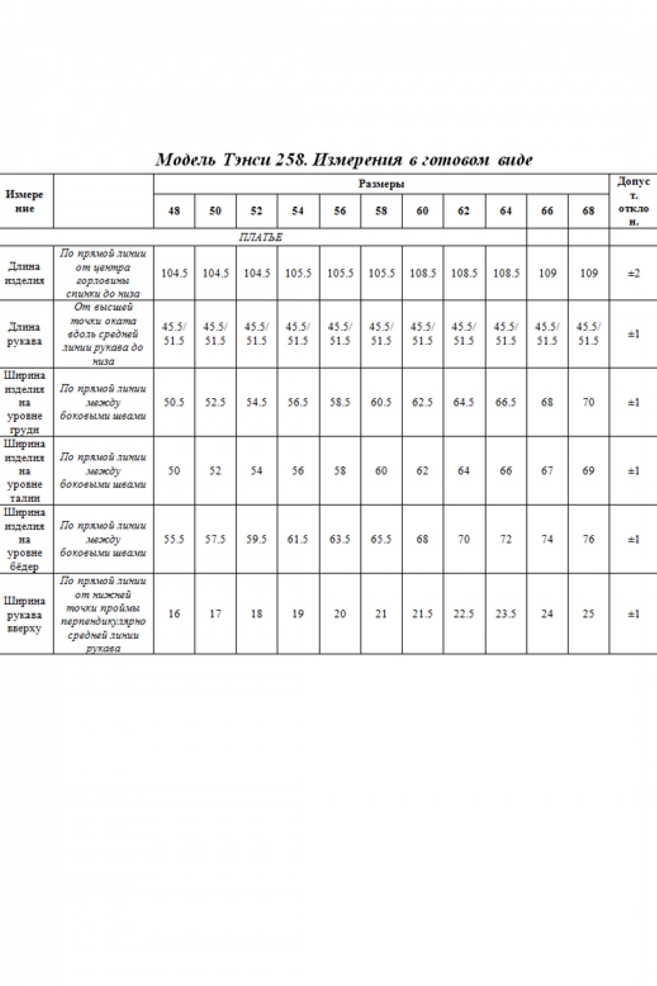 Таблица размеров