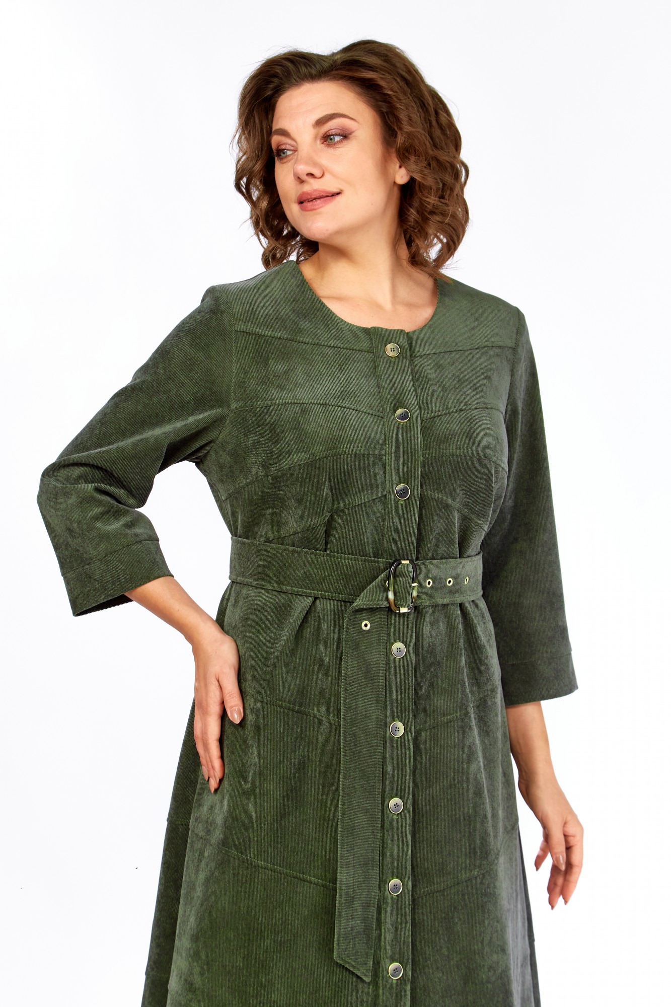 Платье женское А-силуэта из штруксовой ткани в длине миди. Перед с округлым вырезом и центральной застежкой на петли-пуговицы. В боковых швах функциональные карманы. Спинка с кокеткой и средним швом. Перед и спинка платья оформлены косыми подрезами по всей длине изделия. Рукав одношовный втачной, снизу на притачной манжете. Платье дополняет съемный пояс с декоративной пряжкой.
