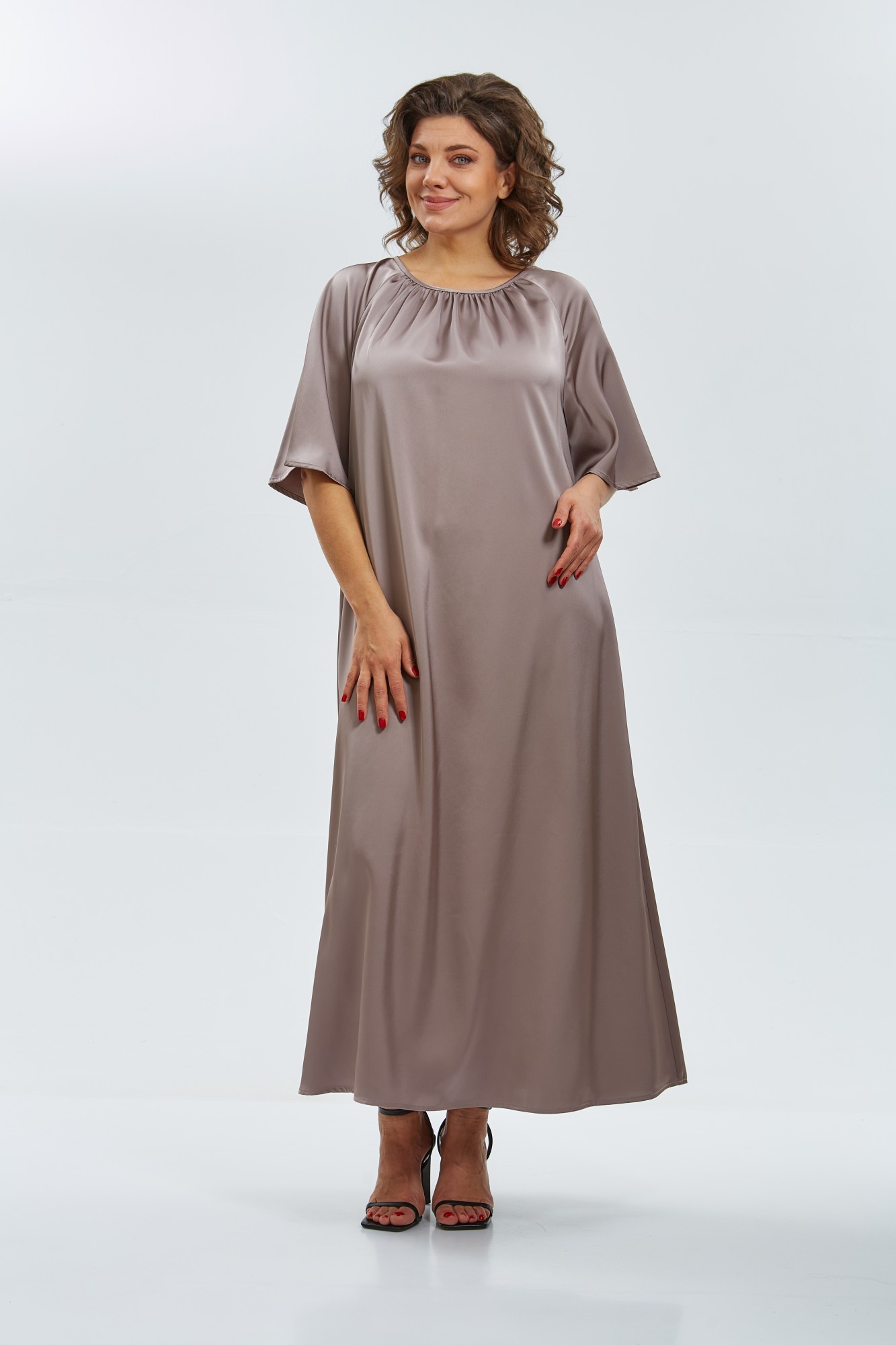 Cочетание элегантности и изысканности. Минималистичное по крою платье длины макси из двустороннего сатина. Вырез горловины округлый, спереди на сборке. Рукав реглан, расширенный к низу. Спинка со средним швом и углубленным разрезом сверху. Линия талии дополнительно подчёркивается поясом с декоративной фурнитурой.