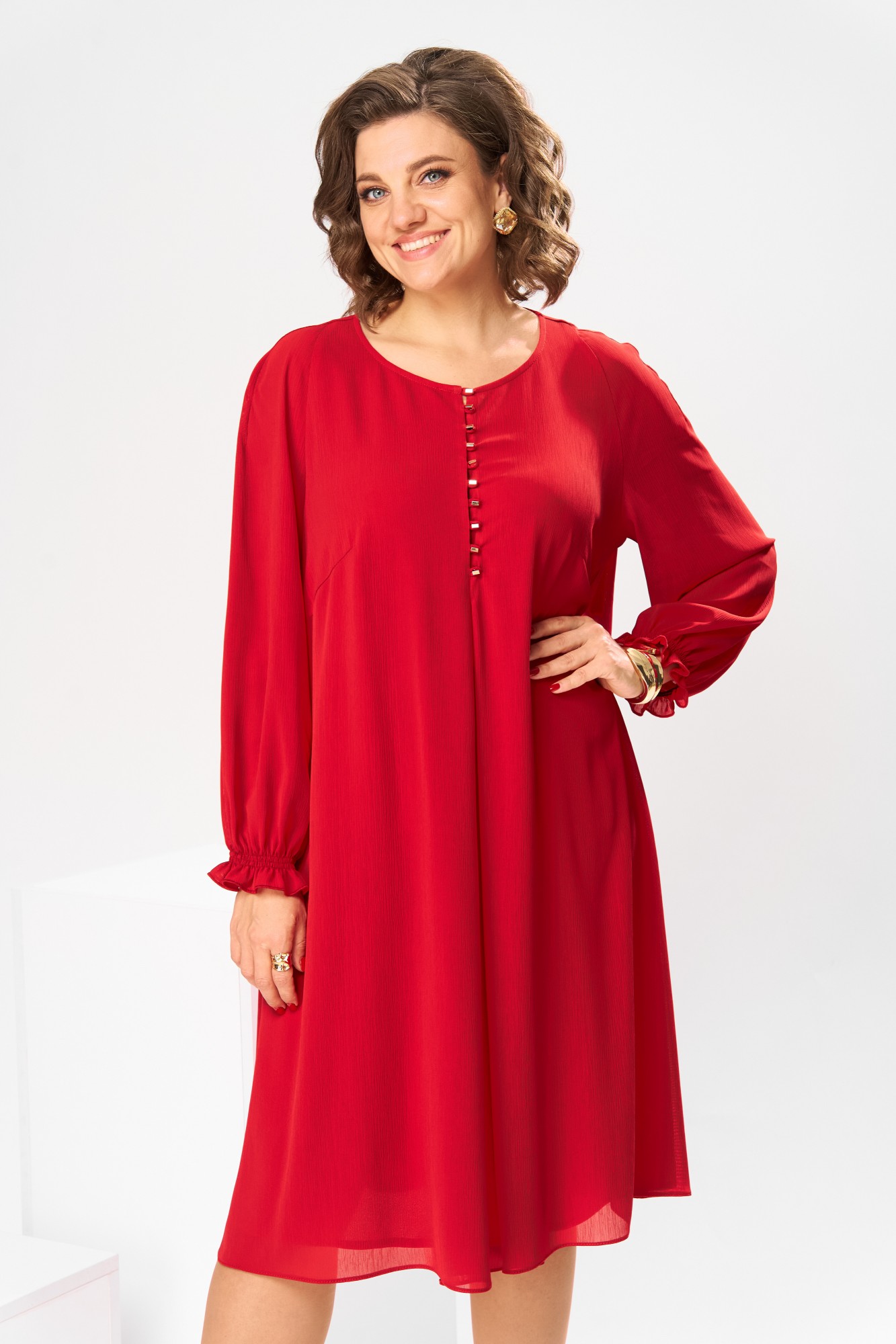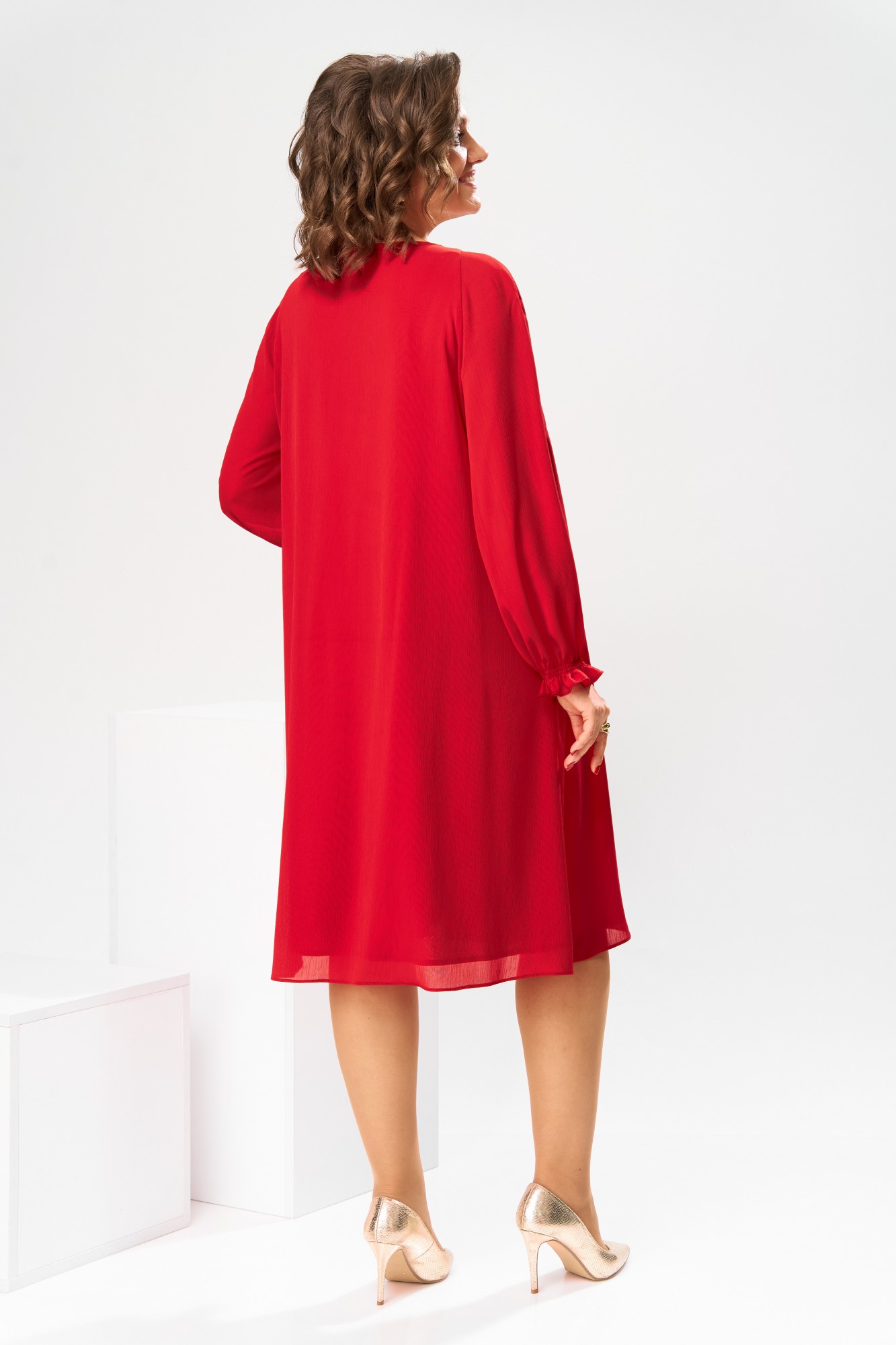 Платье женское расширенное к низу, длиной за колено. Перед с двумя нагрудными вытачками, с разрезом по центру, фиксирующимся на 10 навесных петель и 10 пришивных пуговиц с одной бантовой складкой, выходящей из-под разреза. Спинка цельнокроеная. Горловина круглая, обтачная, без воротника. Рукав полуреглан, втачной, длинный, одношовный, низ рукава собран на эластичную тесьму. Платье на подкладке.