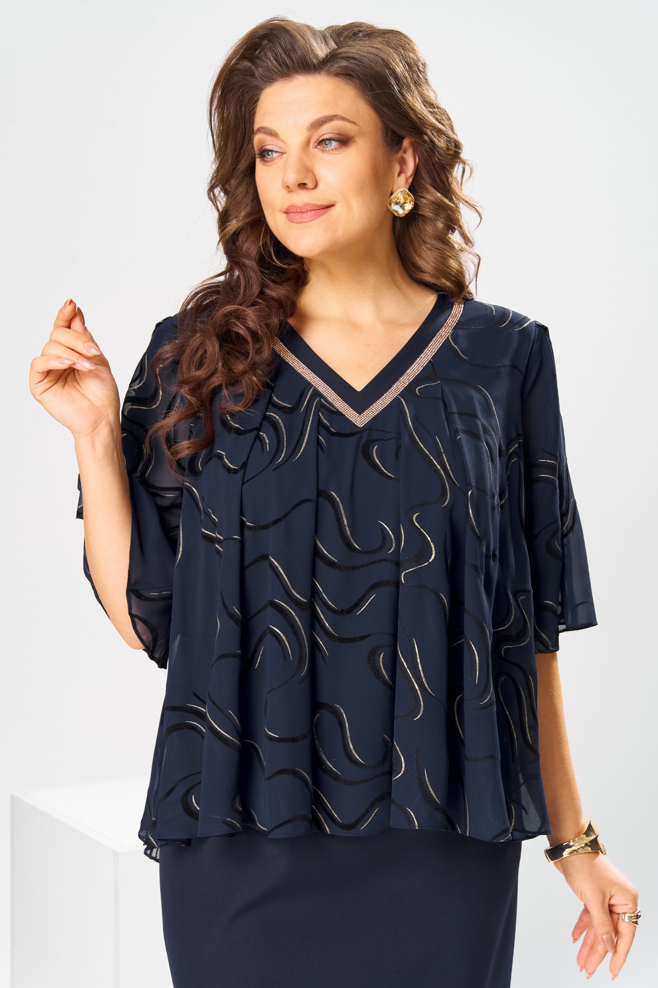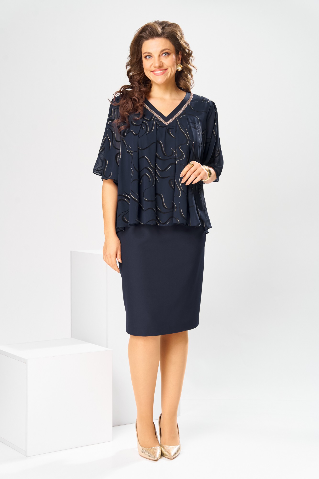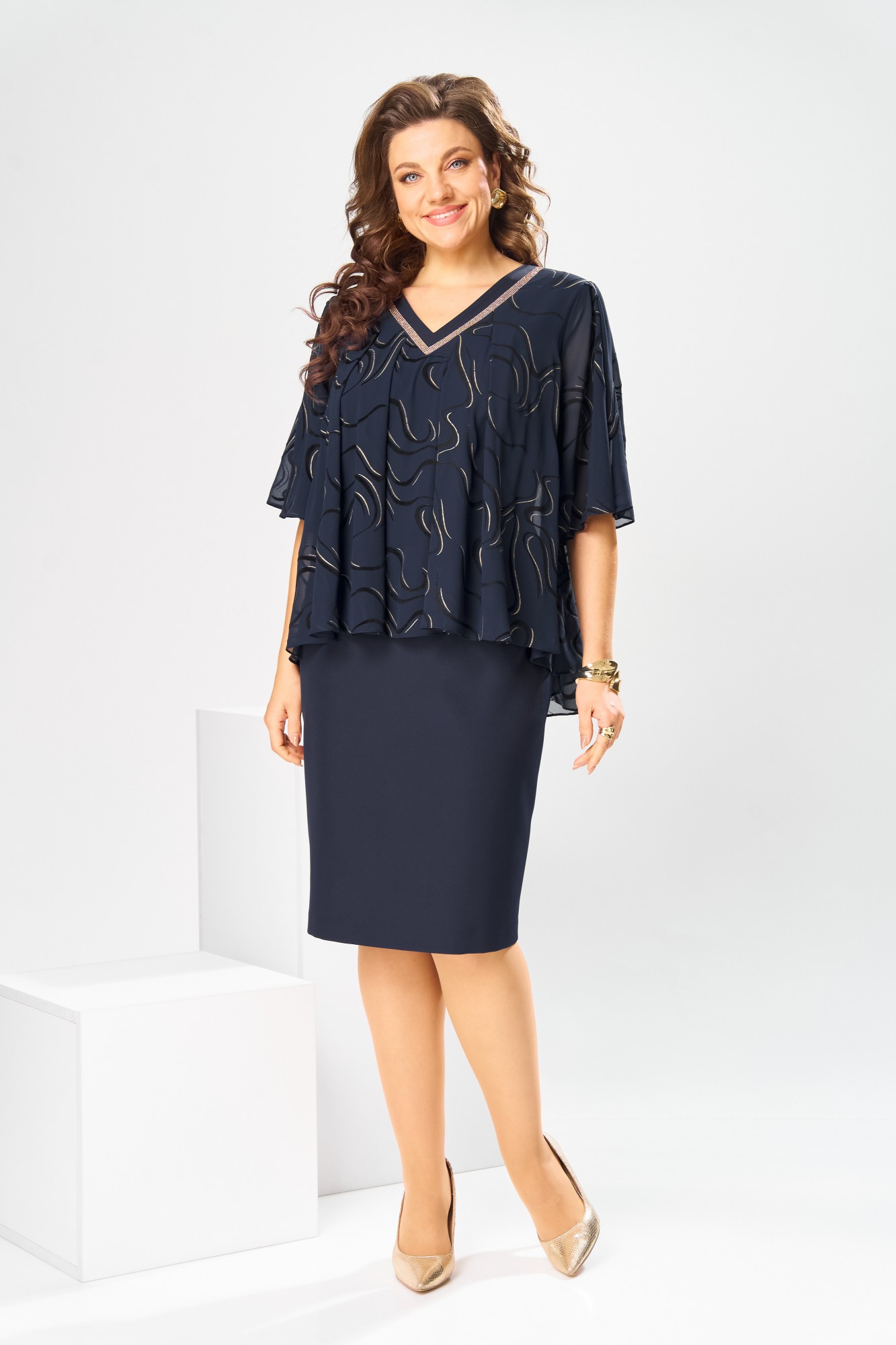 Платье женское относится к нарядной торжественней одежде. Платье полуприлегающего силуэта, длиной за колено. Перед с двумя нагрудными и двумя таллиевыми вытачками, с отрезной планкой по горловине, декорированной отделочной термотесьмой. Спинка с двумя таллиевыми вытачками и средним швом, заканчивающимся разрезом. Застежка на потайную тесьму-молнию в левом боковом шве платья. По горловине и проймам к платью закреплена отлетная накидка из отделочной ткани. Перед накидки с 4-мя односторонними складками, зафиксированными от горловины. Накидка с фигурным низом. Рукав втачной, одно шовный, расширенный к низу, по окату рукава закреплена глубокая односторонняя складка, рукав длиной до локтя. Платье с плечевыми накладками.