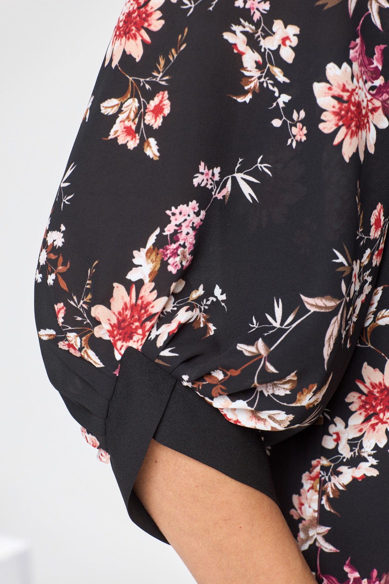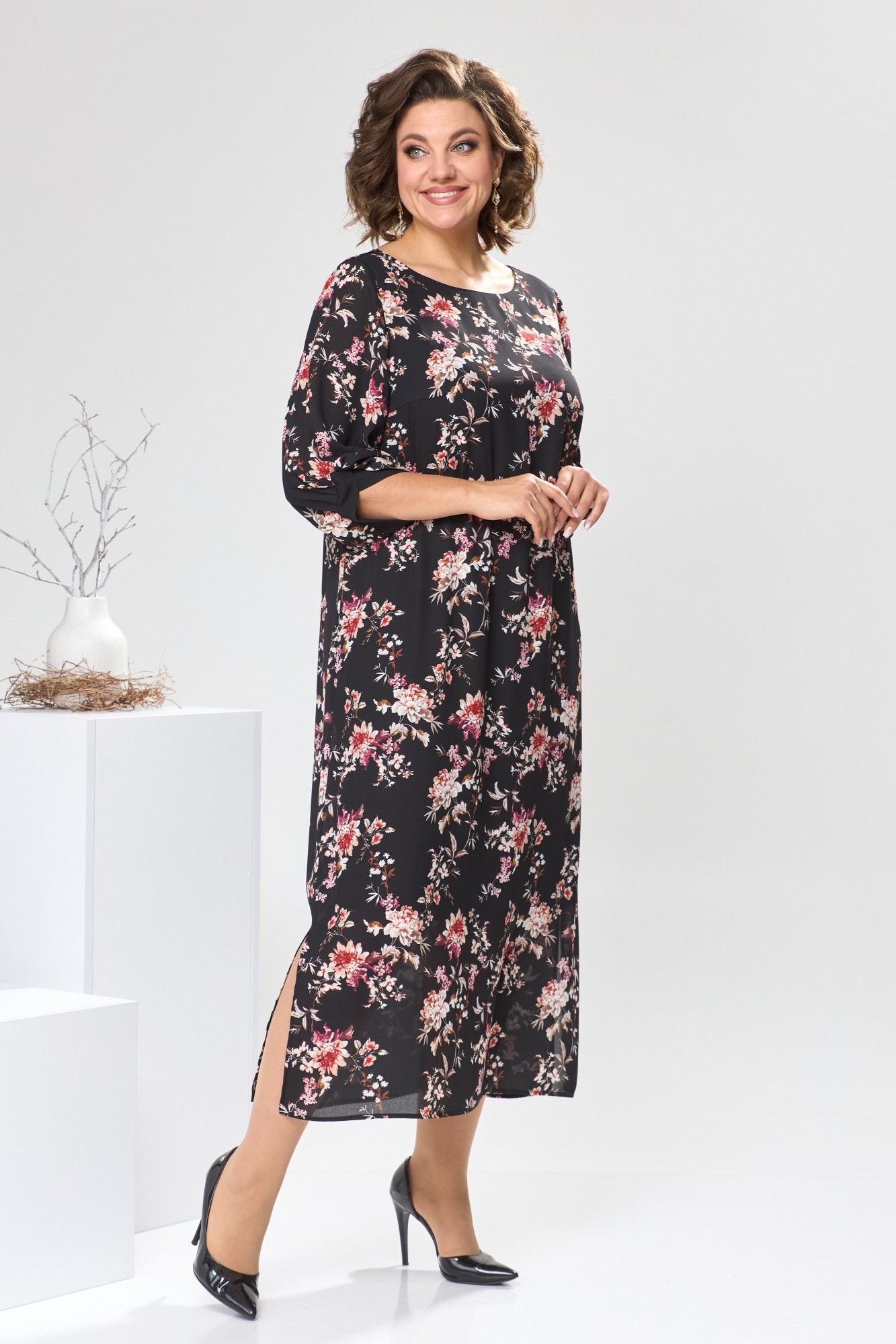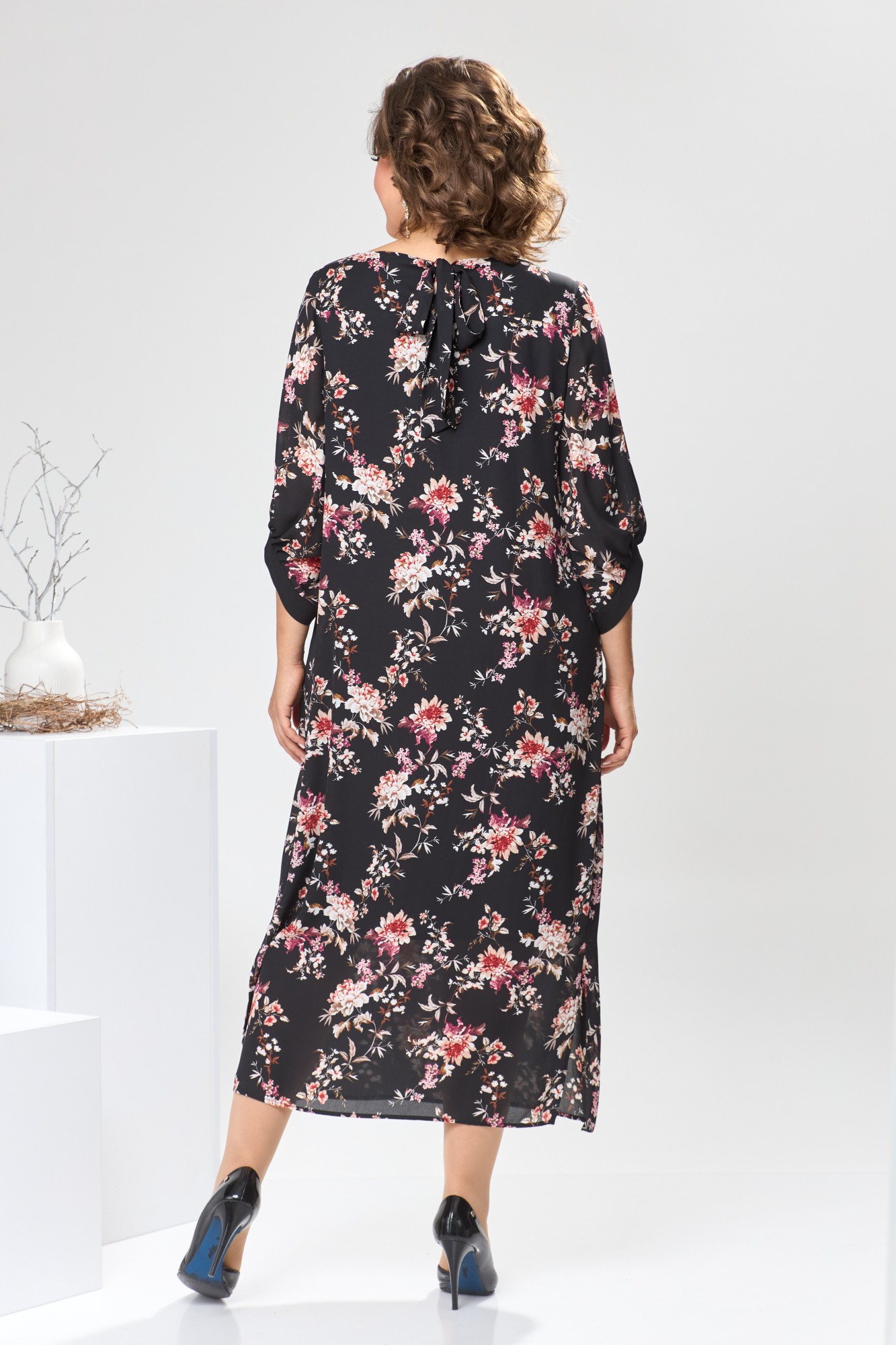 Платье женское относится к нарядной торжественной одежде. Платье женское прямого силуэта, длиной до нижней части икры. Перед с 2-мя нагрудными вытачками. Спинка с отрезной кокеткой с фигурным обтачным разрезом, фиксирующимся по горловине на 2-е обточные завязки. Горловина круглая, обтачная, без воротника. Рукав втачной, одношовный, длиной 3/4 с фигурным низом с 14-ю односторонними складками (по 7 с каждой стороны от угла манжеты), с притачной манжетой из отделочной ткани. Боковые швы с разрезами. Платье на подкладке. Платье без плечевых накладок.