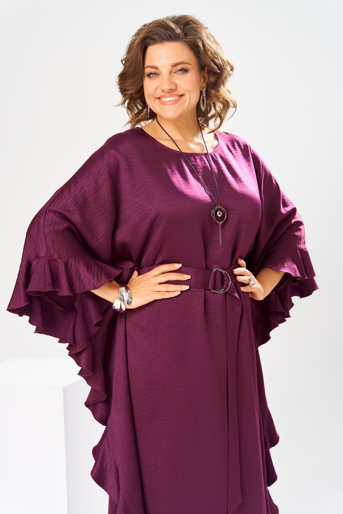 Платье женское, относится к нарядной торжественной одежде. Платье пончо свободного кроя, длинное. Перед цельнокроеный. Спинка со средним швом, вверху с разрезом, фиксирующимся по горловине на 1-ну навесную петлю и 1-ну пришивную пуговицу. Горловина круглая, обточная, без воротника, по переду горловины отделочная строчка 0,6 см. Рукав цельнокроеный удлинённый. Низ рукава и боковые швы декорированы приточной оборкой. По боковым швам зафиксирован уровень пройм и место расположения петель на уровне линии талии отделочными строчками. К платью прилагается съёмный пояс с пряжкой, фиксируемые на платье в петли на уровне линии талии. Платье без плечевых накладок.