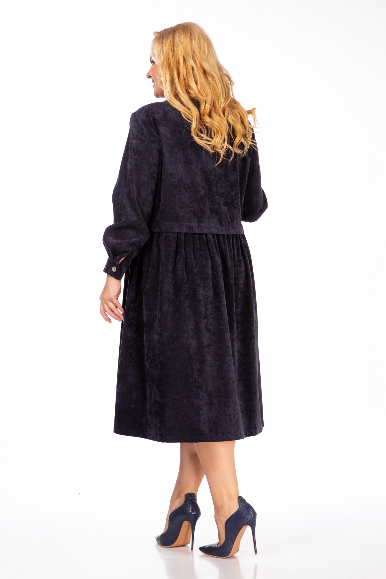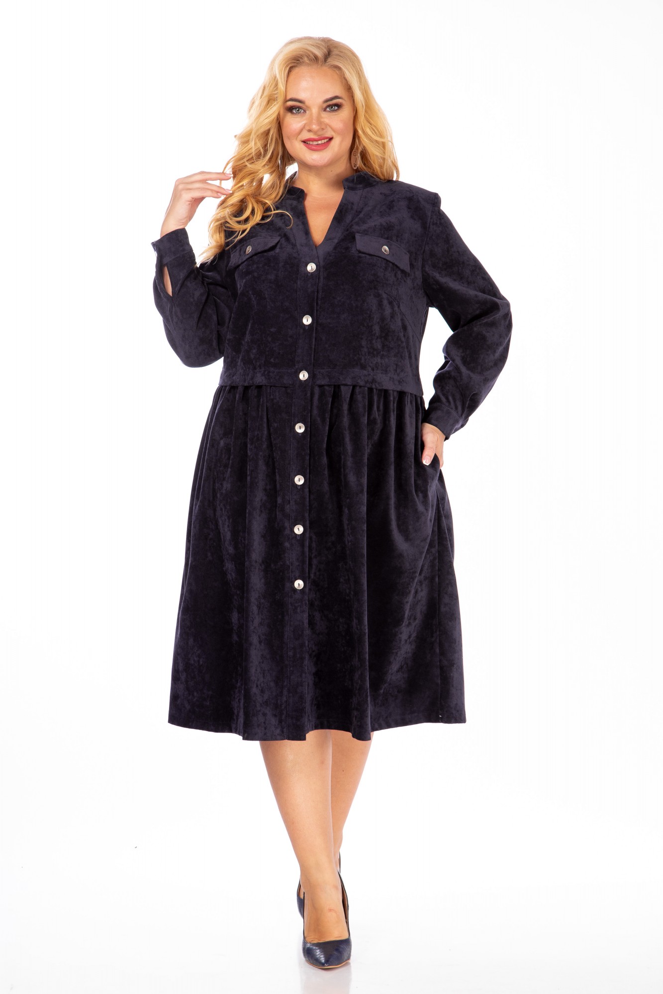 Силуэт полуприлегающий, расширенный к низу. Рукав втачной, одношовный. Низ рукава со складками и на манжете с застёжкой на пуговицу. Горловина круглая, оформлена отрезной плосколежащей стойкой. Перед с отрезной застёжкой до низа на пуговицы. Полочки с нагрудными вытачками. Вверху полочек настрочены клапаны, которые декорированы пуговицами. Платье на уровне талии отрезное. По линии подреза заложена отлетная складка. По нижней части платья выполнена сборка. На уровне бёдер в боковых швах выполнены потайные карманы.