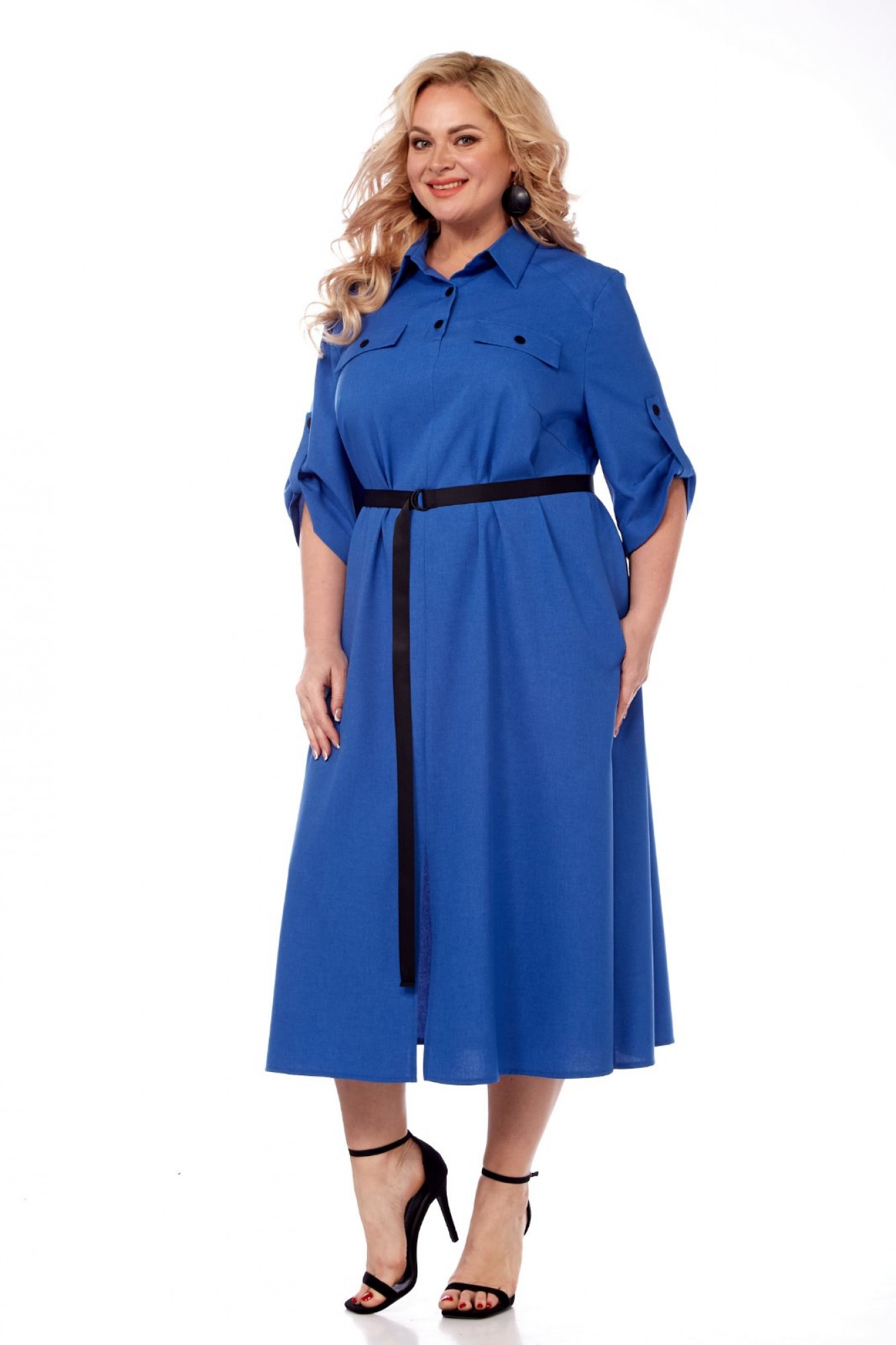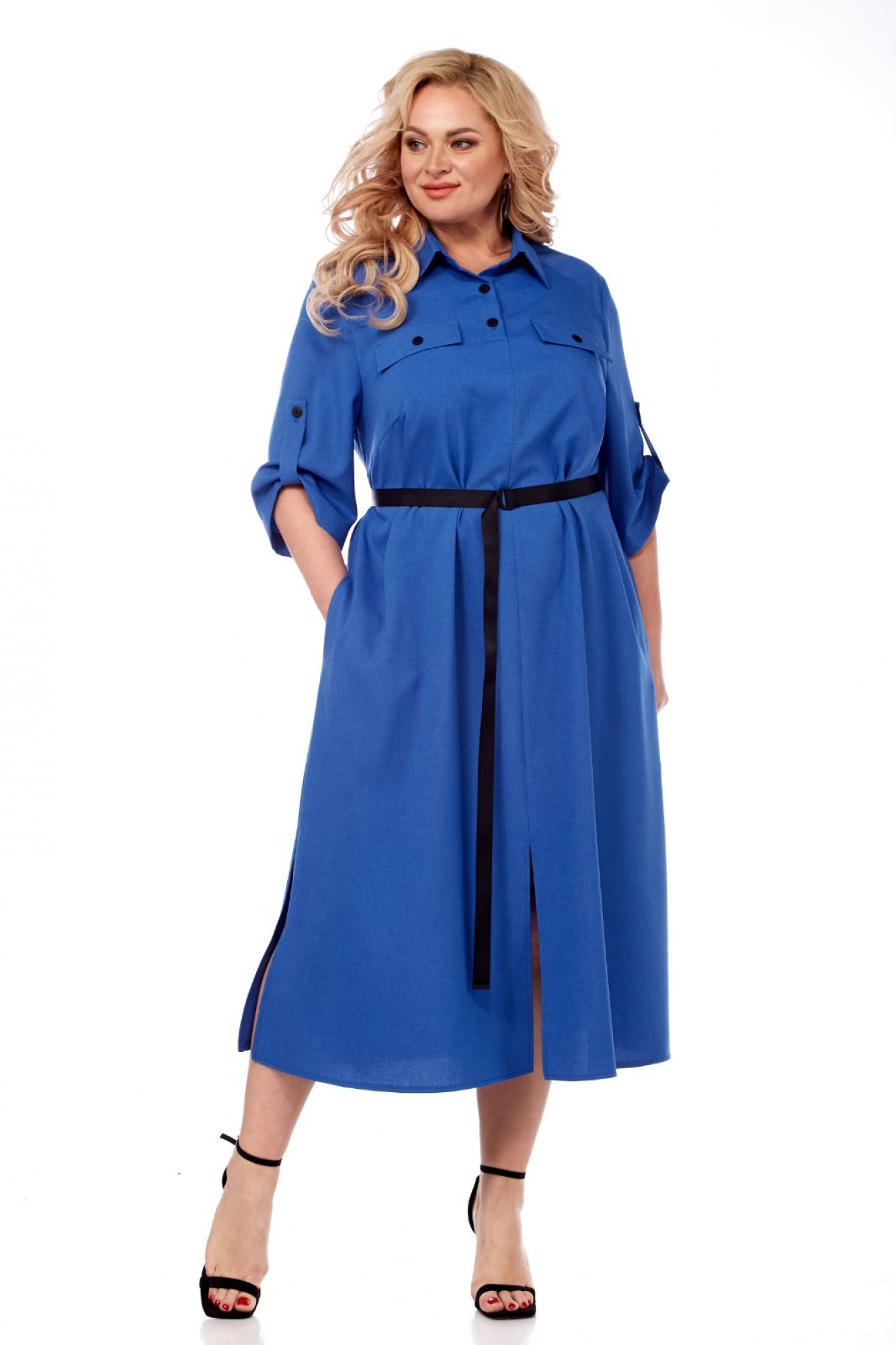 Силуэт полуприлегающий, расширенный к низу. Рукав втачной, одношовный. Низ рукава драпируется патой с застёжкой на пуговицу. Горловина с отложным воротником на стойке, рубашечного типа. Перед со средним швом, кокетками и нагрудными вытачками. Вверху по среднему шву выполнена застёжка на две пуговицы. В верхней части переда расположены клапаны, декорированные пуговицами. На уровне бёдер в боковых швах выполнены потайные карманы. Внизу среднего и боковых швов платье с разрезами. В комплекте к платью идёт пояс контрастного цвета с застёжкой на пряжку.