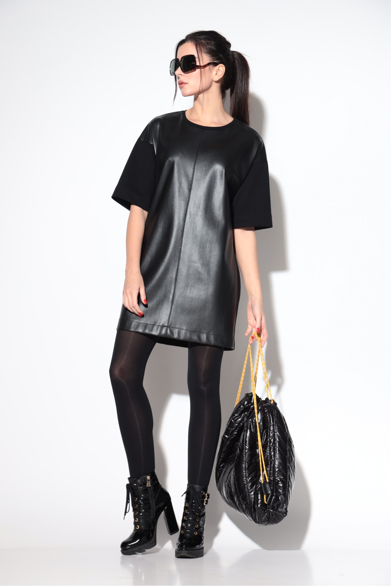 Платье мини в черном цвете. Передняя часть платья выполнена из качественной эко-кожи на "замшевой основе". Спинка и рукава из высококачественного трикотажного полотна . Перед со средним швом и отделочной строчкой. Модель со спущенной линией плеча. По горловине бейка из трикотажного полотна. Трендовым дополнением к платью служат длинные перчатки из эластичного трикотажа . Мини платье - трансформер, с которым можно создавать разнообразные образы. Его можно носить с брюками, как тунику, на работу. Или как игривое мини на вечеринку, а одев под платье теплый гольф с лосинами, на прогулку.