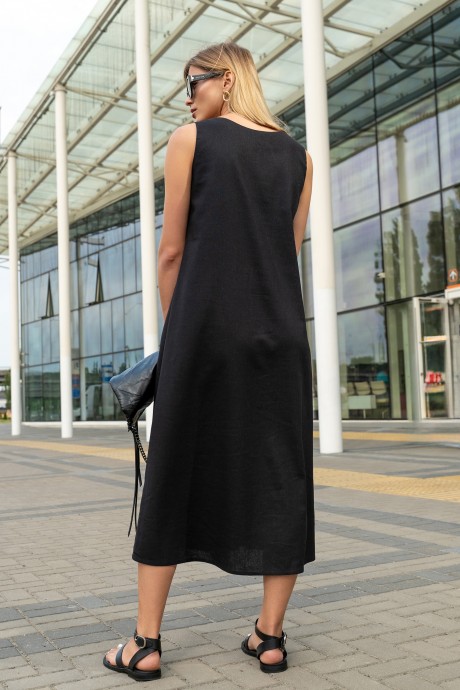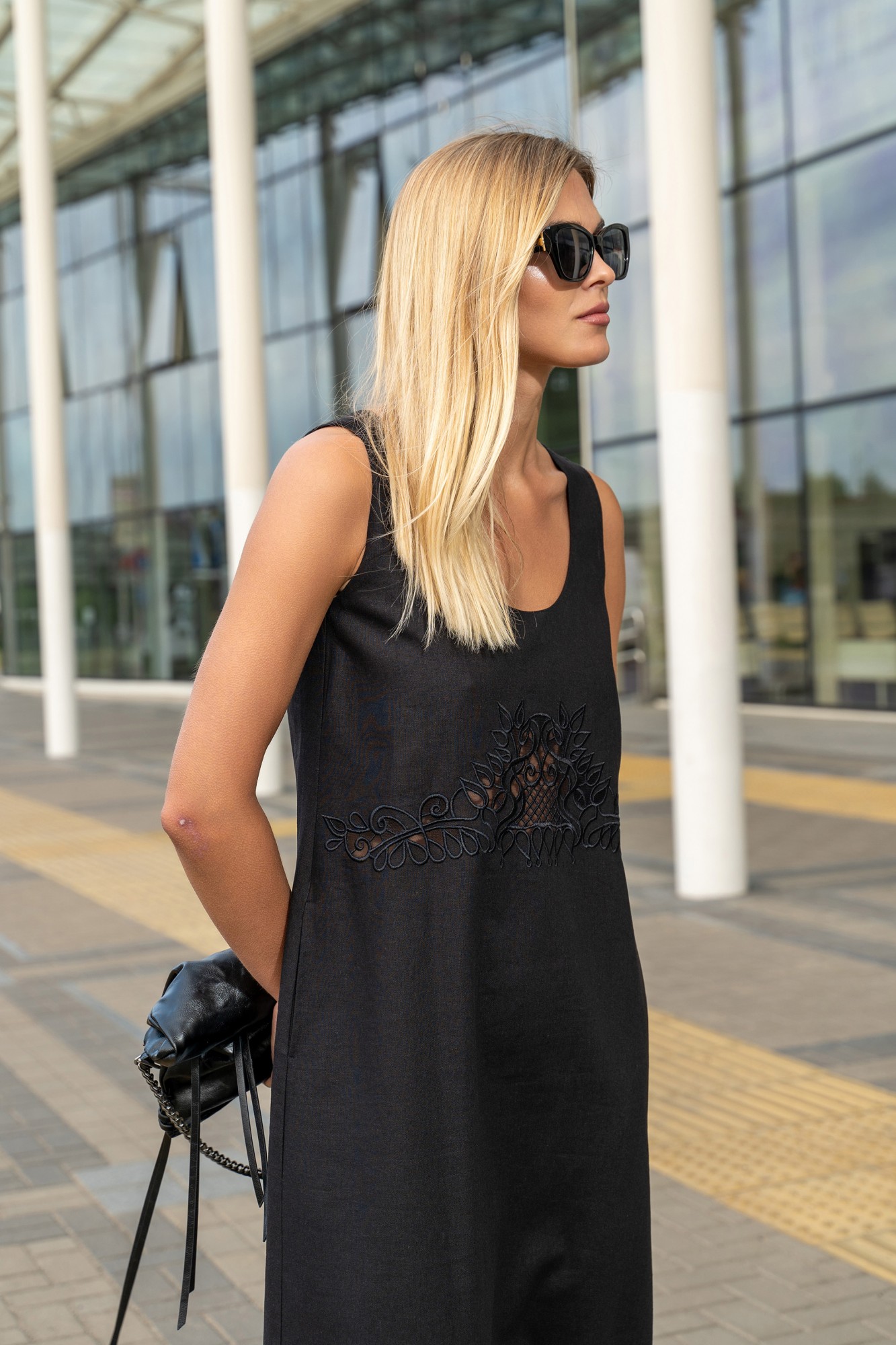 Стильное платье миди, свободного силуэта, расширенное к низу. Центральная часть переда с декоративной вышивкой. В боковых швах функциональные карманы. Изысканное платье идеально подходит на торжественный вечер и на повседневность.