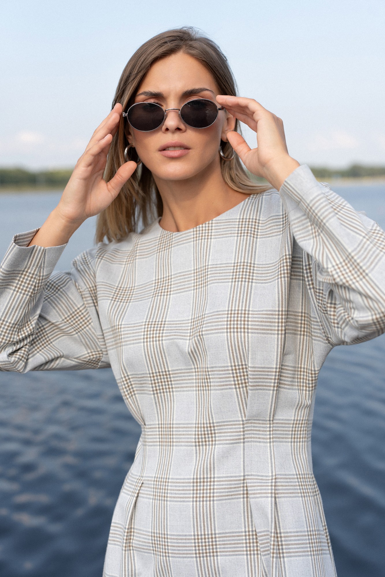 Стильное платье , приталенного силуэта в модном клетчатом принте. Центральная часть переда с застроченными складками на талии, спинка со средним швом и талиевыми вытачками. Застежка молния в среднем шве спинки. В боковых швах функциональные карманы.