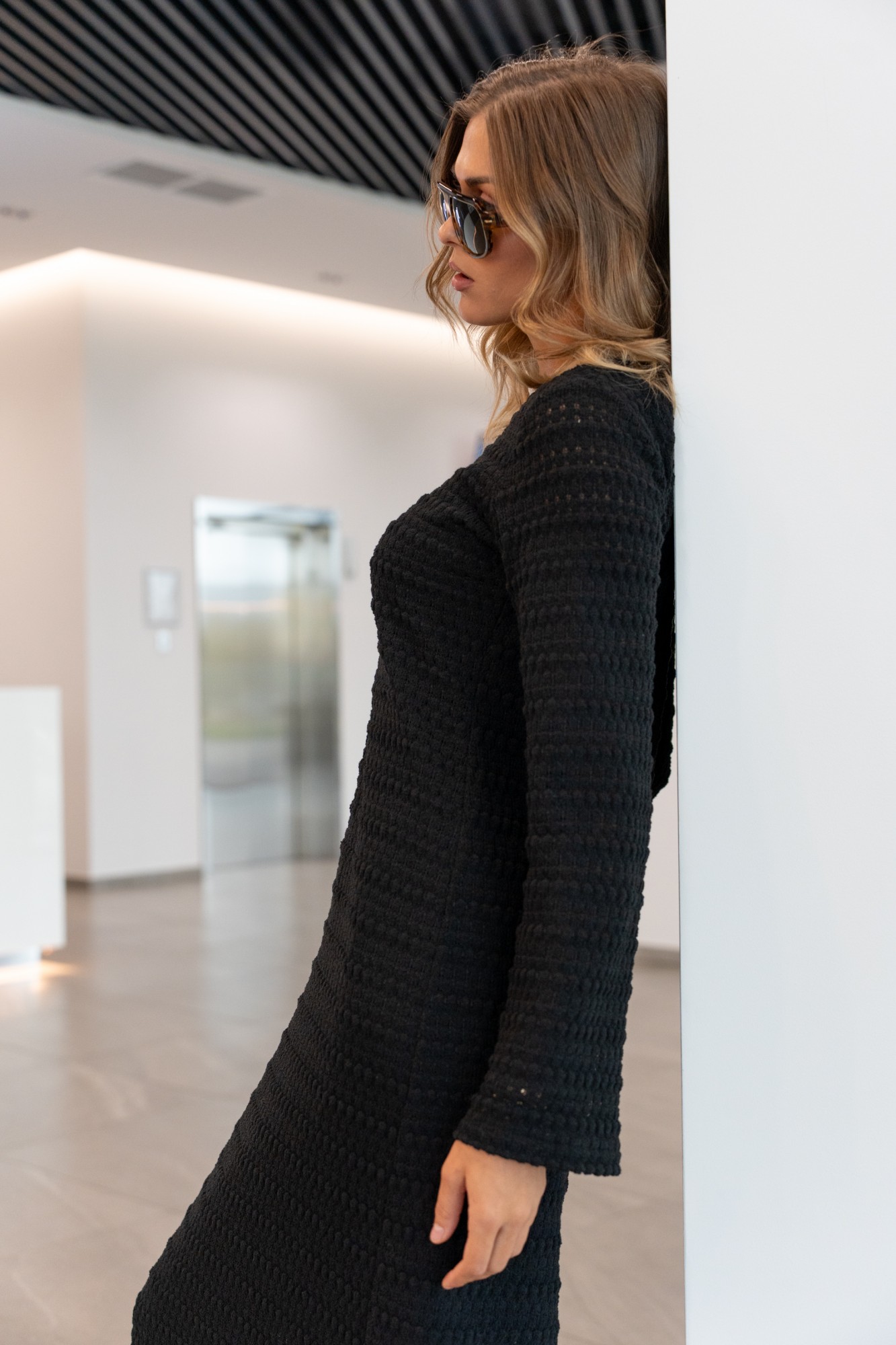 Платье макси из трикотажа, полуприлегающего А-образного силуэта. Рукав втачной прямой. Горловина округлой формы, обработана бейкой. Полупрозрачная "вязаная" текстура трикотажа делает платье стильным и романтичным. Подкладкой служит отдельное нижнее платье-комбинация на бретелях из трикотажного полотна.