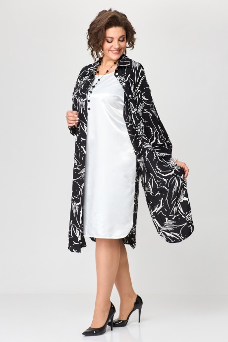 Платье состоит из удлинённой рубашки с отложным воротником. По передней части планка, застежка-пуговицы. Свободный крой, по бокам фигурные подрезы. Вторая деталь этого наряда - имитация платья. То есть передняя часть платья однотонного черного цвета вшита по боковым швам в саму рубашку и создается впечатление, что наряд двухпредметный. В расстёгнутом виде смотрится как платье и поверх надета рубашка. Однотонная часть платья выполнена из мягкой и приятной ткани . Ткань цветная на вид как плотный атлас.