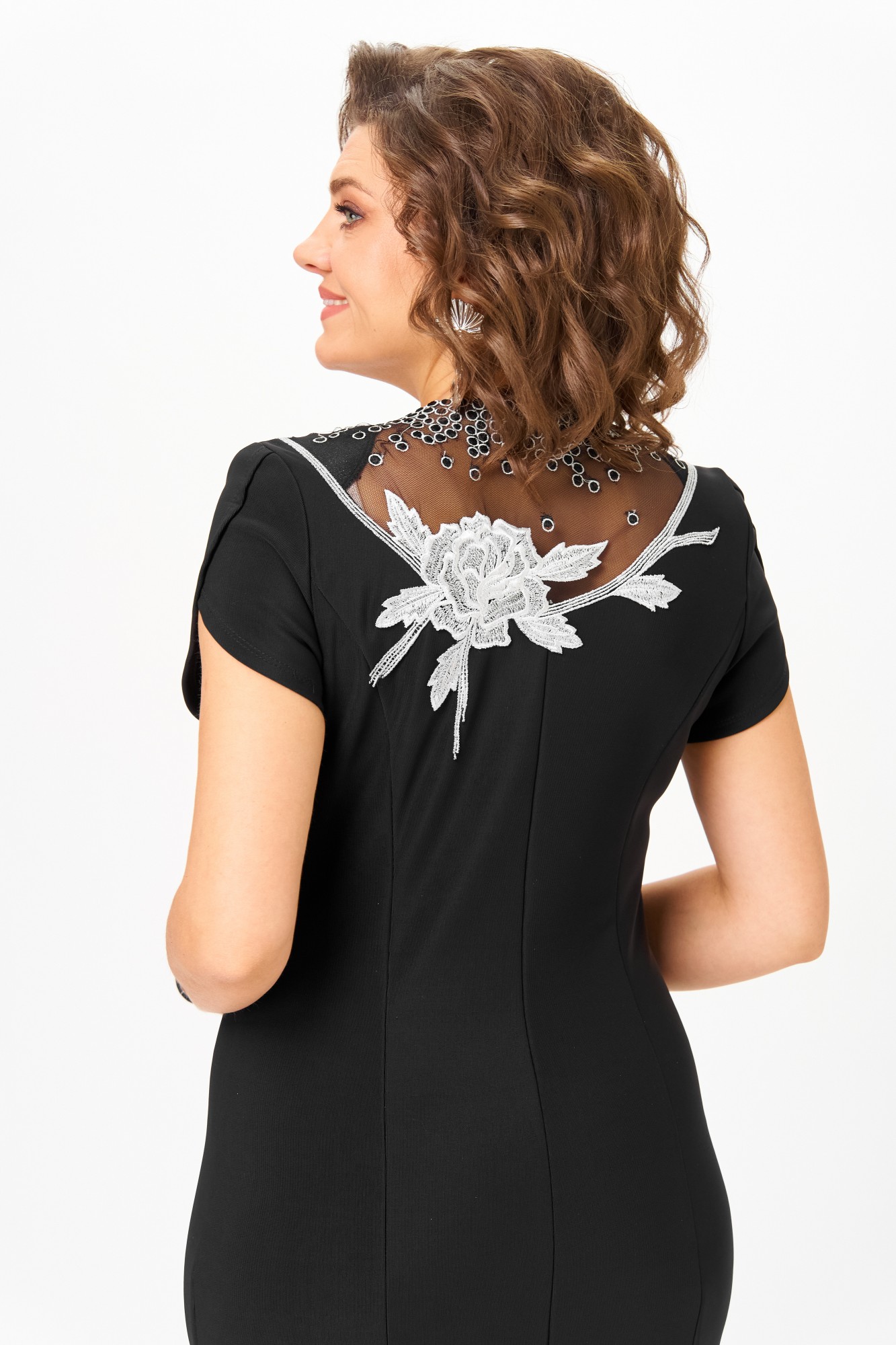 Платье облегающего силуэта. Украшением изделия служит вставка-аппликация вышитая на сетке. Аппликация расположена спереди и по спинке платья. По передней части рельефы, внизу полочки слева вырез. Рукава короткие фигурные.