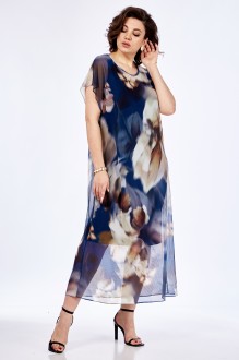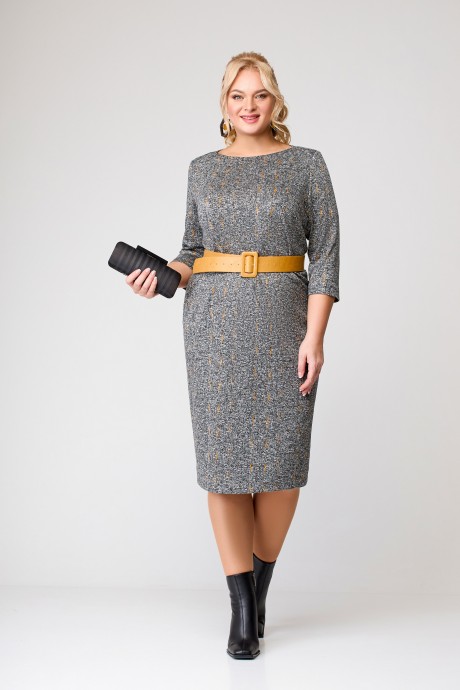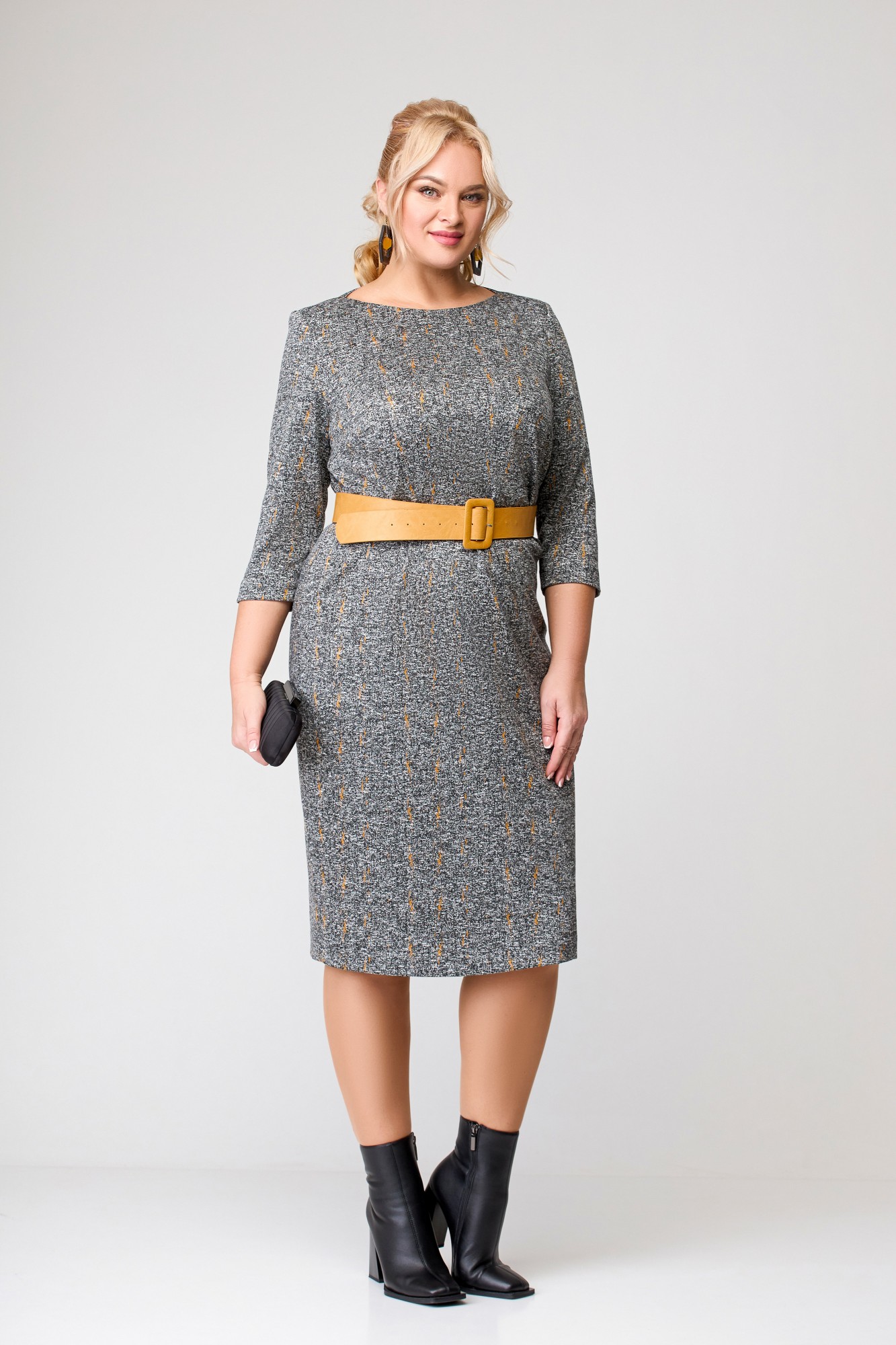 Платье полуприлегающего силуэта, длиной миди. Платье выполнено из трикотажного полотна. Рукав длиной ¾. Горловина платья полукруглая. По переду платья расположены нагрудные вытачки. Верхяя часть спинки, цельнокроеная с фигурной кокеткой переда. Спинка с талиевыми вытачками и средним швом, в который вставлена потайная молния. По низу спинки обработан разрез.