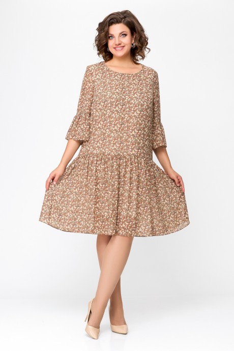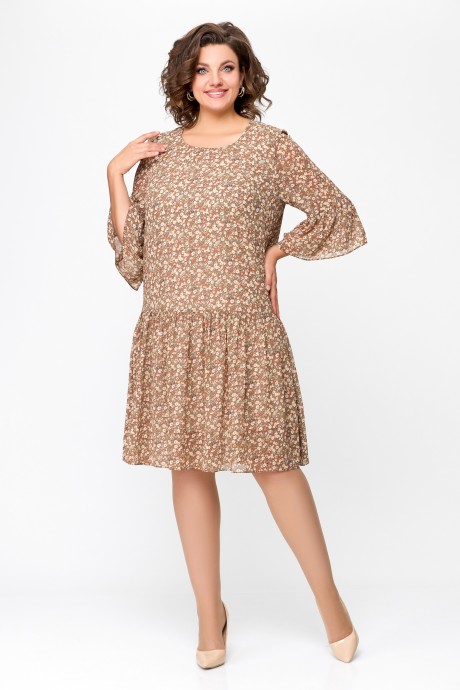 Платье женское прямого силуэта из лёгкой шифоновой ткани на эластичной подкладке. Передняя половинка платья цельнокроеная. Задняя половинка цельнокроеная с разрезом по горловине длиной 8 см, застёгивающимся на навесную петлю и потайную пуговицу. Нижняя часть платья длиной 42 см, со сборкой. Горловина округлой формы.