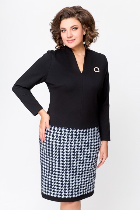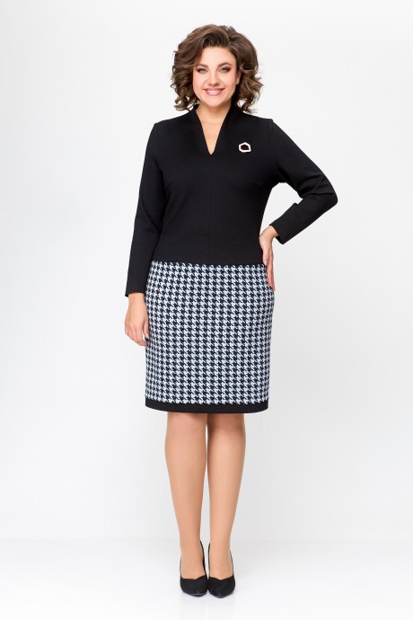 Платье женское полуприлегающего силуэта из эластичного трикотажного полотна. Платье отрезное ниже линии талии. Верхняя однотонного полотна, нижняя часть – с дизайном «гусиная лапка». Передняя часть лифа со средним швом и нагрудными вытачками. Спинка лифа со средним швом и талиевыми вытачками. По горловине спинки обработана притачная стойка высотой 3 см, плавно переходящая в V-образный обработанный обтачкой. Передняя и задняя части юбки цельнокроеные с отрезной планкой по низу из однотонной ткани шириной 3 см. В комплект входит декоративное украшение-брошь.