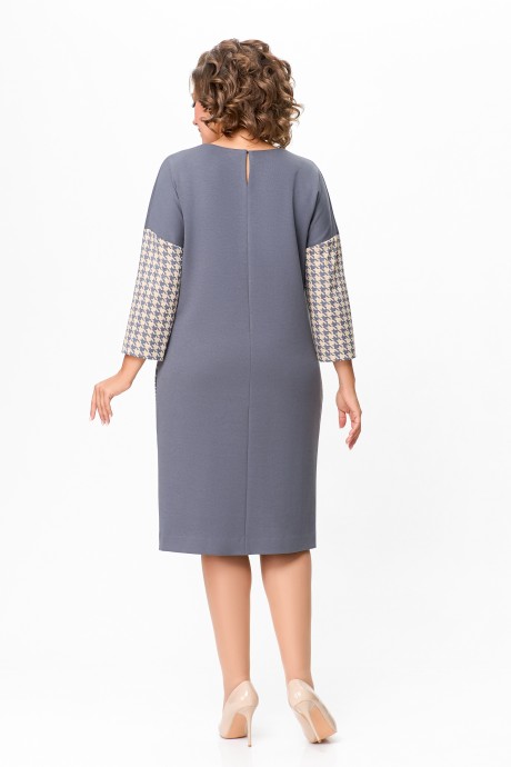 Платье женское полуприлегающего силуэта из хлопкового трикотажного полотна. Платье со спущенными рукавами длиной 3/4 из отделочной ткани. Верхняя часть переда выполнена из однотонного полотна, нижняя часть – с дизайном «гусиная лапка». Спинка платья из основной ткани, разрезная. В среднем шве спинки по горловине расположен разрез длиной 7 см, застёгивающийся на навесную петлю и потайную пуговицу. В боковых швах обработаны карманы.