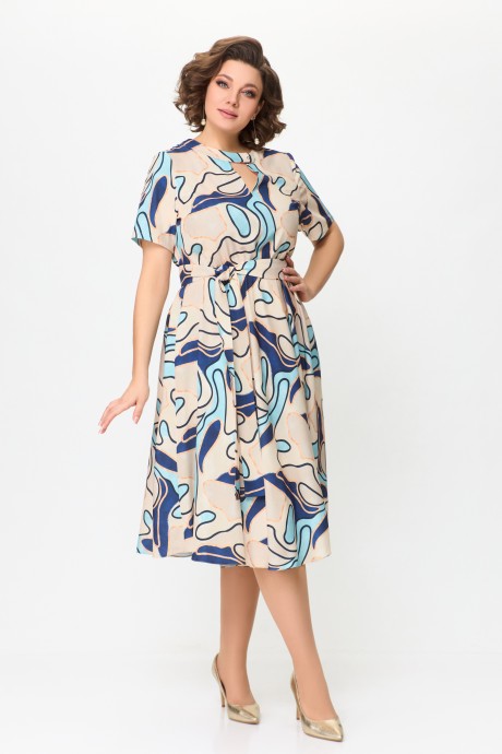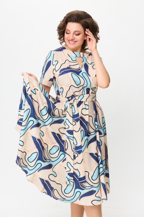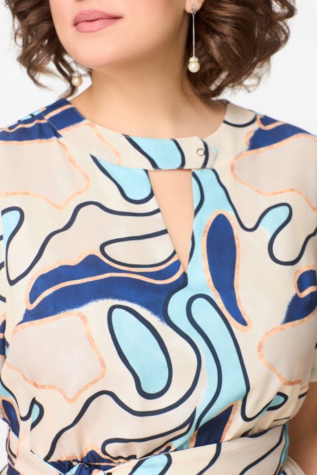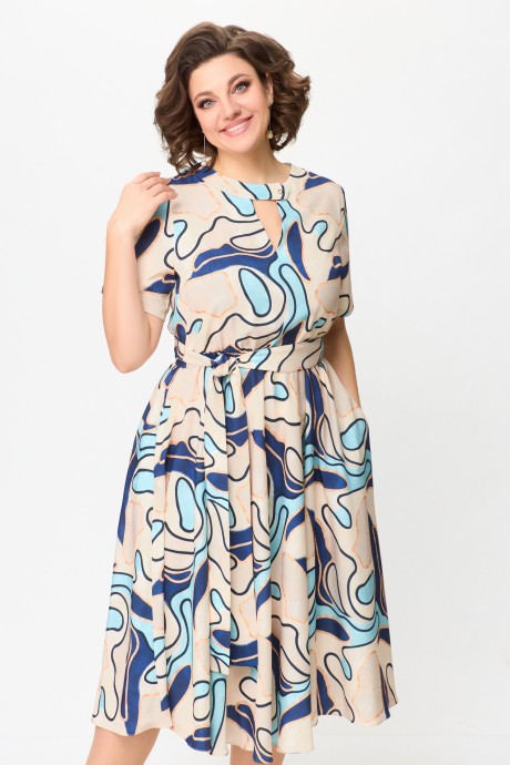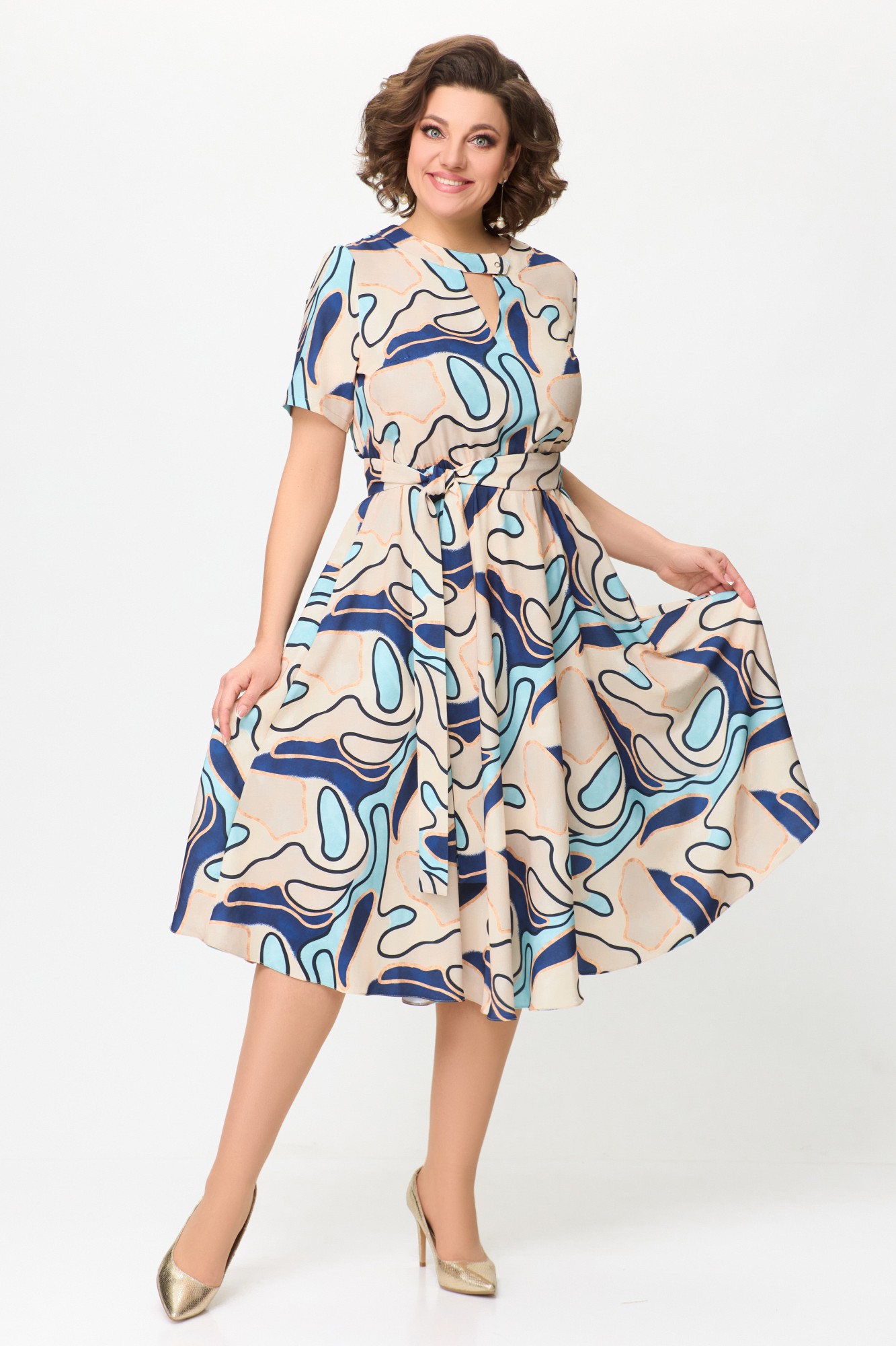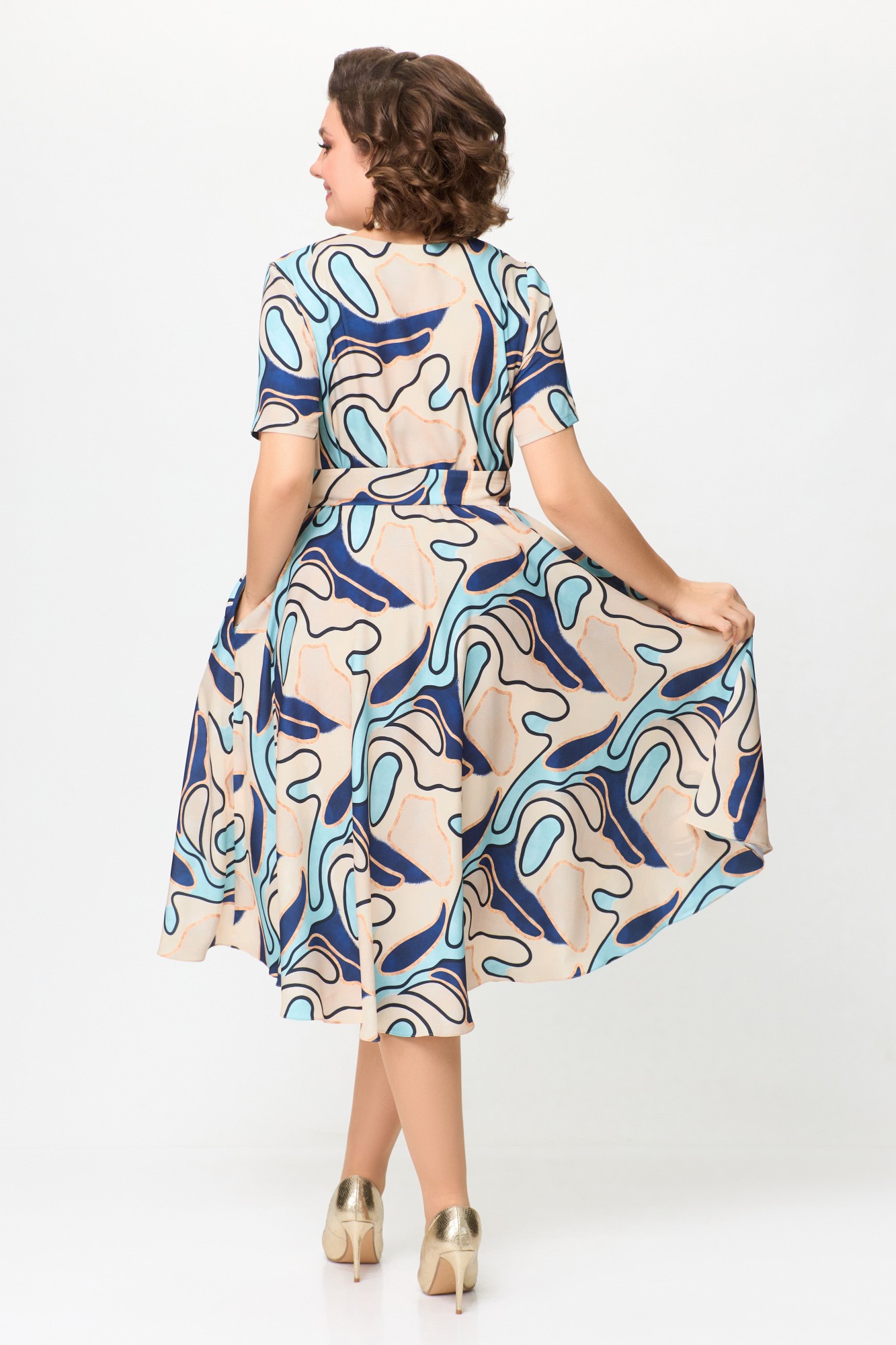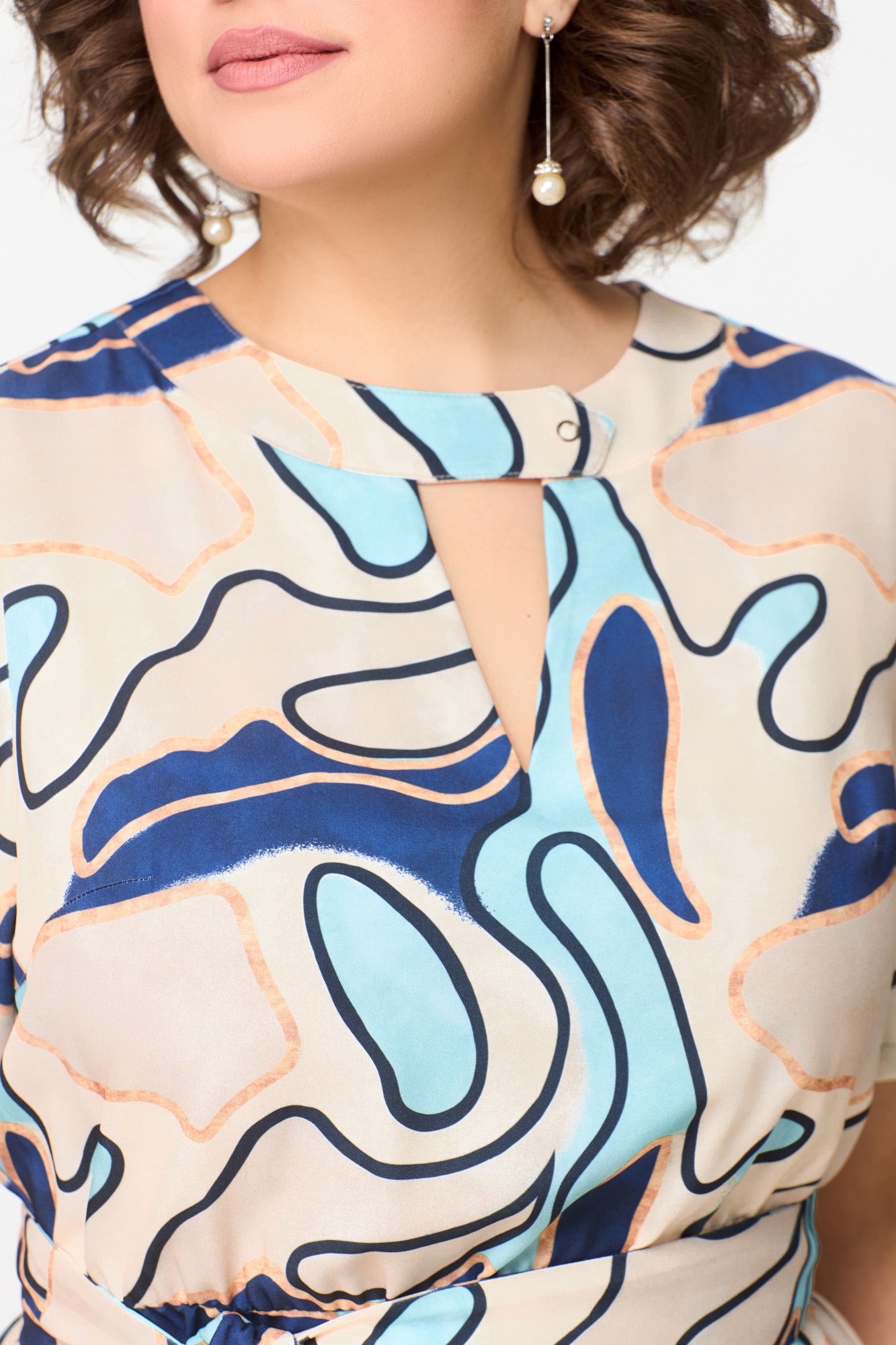 Платье из тонкого текстиля Х-образного силуэта, отрезное по линии талии. По переду лифа обработаны нагрудные вытачки, удлинённый V-образный вырез и отрезанная декоративная кокетка с застёжкой на кнопку. Спинка лифа цельнокроеная. Юбка расклешённая с карманами в боковых швах. Рукав короткий. По талии платье собрано на эластичную тесьму. В комплекте ремень из основной ткани.
