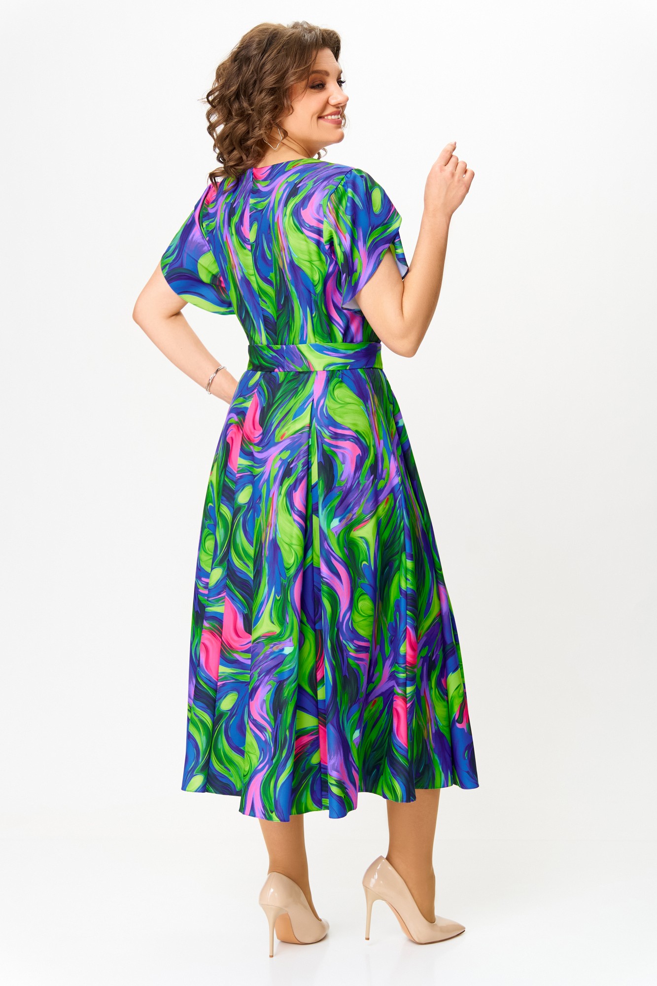 Платье из мягкой вискозной ткани Х-образного силуэта с полуприлегающим лифом. Платье отрезное по линии талии. По переду лифа расположены рельефы, по спинке лифа таллиевые вытачки. Юбка расклешенная из шести клиньев со встречными складками по линии талии. В среднем шве спинки предусмотрена потайная тесьма-молния. Рукав втачной покроя тюльпан, длина рукава 15 см. В комплекте ремень с декоративной пряжкой. В размере 64 пояс из основной ткани.