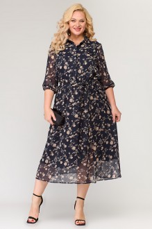 Платье из тонкого текстиля Х-образного силуэта, отрезное по линии талии. По переду лифа обработаны нагрудные вытачки, удлинённый V-образный вырез и отрезанная декоративная кокетка с застёжкой на кнопку. Спинка лифа цельнокроеная. Юбка расклешённая с карманами в боковых швах. Рукав короткий. По талии платье собрано на эластичную тесьму. В комплекте ремень из основной ткани.