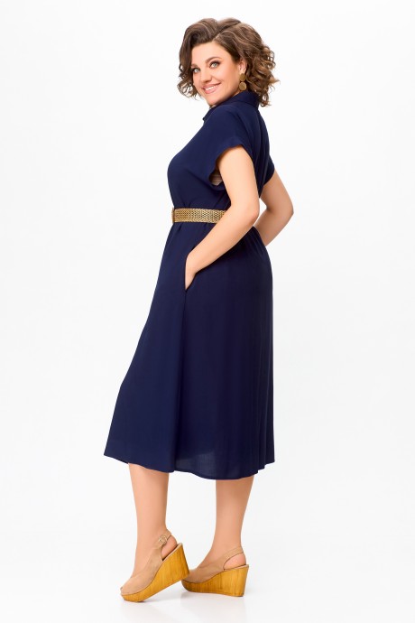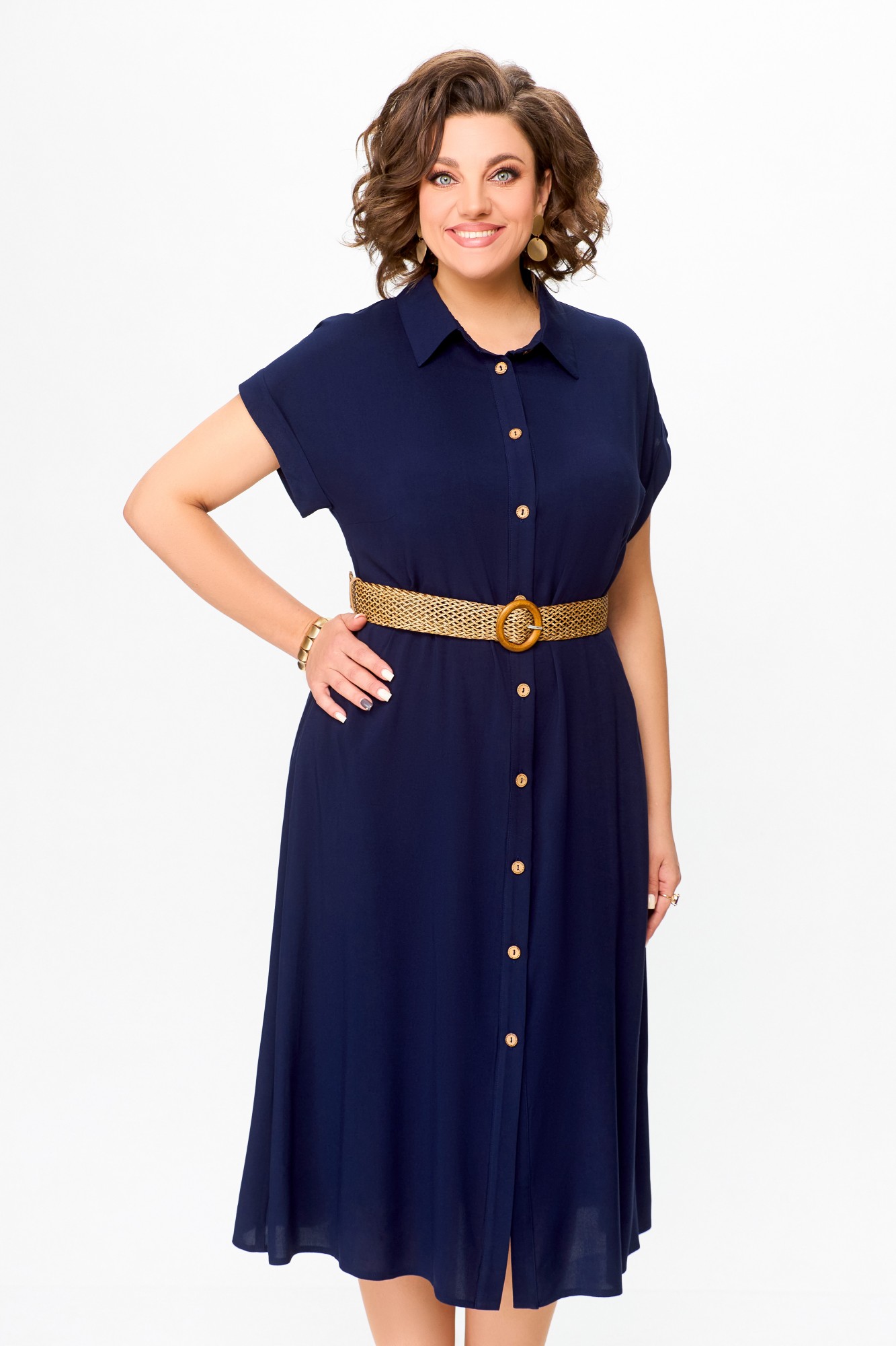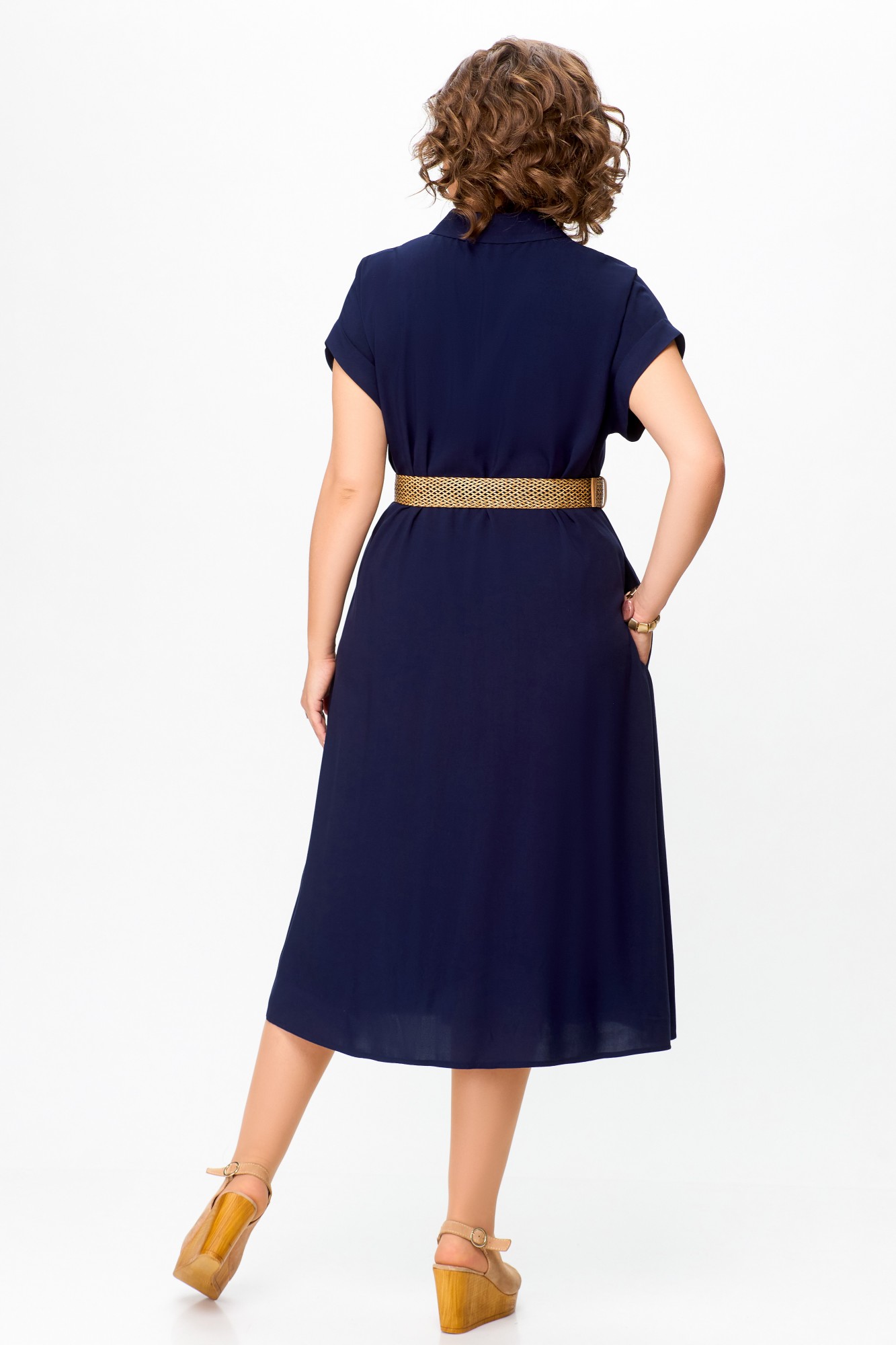 Платье-рубашка свободного кроя, расклешённое к низу. Застёжка центральная на петли и декоративные пуговицы, пройма спущенная с отложной манжетой. Спинка цельная. Воротник отложной со стойкой. В боковых швах предусмотрены карманы. По желанию подчеркнуть талию можно ремнём, идущим в комплекте.