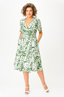 Платье женское полуприлегающего силуэта, выполнено из вискозной ткани. Платье отрезное по линии талии, с декоративным напуском-планкой на юбку, на котором пришит фирменный логотип. Юбка платья присборена по талии, в боковых швах обработаны карманы. Перед лифа с нагрудными вытачками, по спинке лифа талиевые вытачки. Спинка платья со средним швом, в который вставлена потайная молния. Рукав втачной короткий.