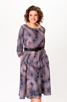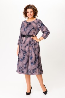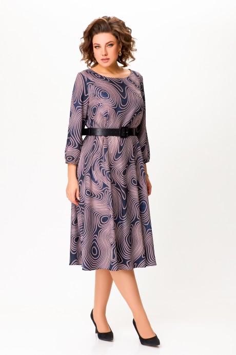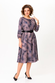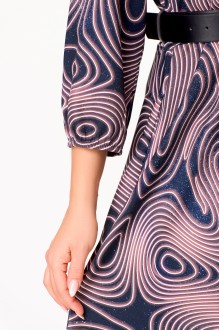 Платье из мягкой вискозной ткани, Х-образного силуэта, отрезное по линии талии. Перед и спинка лифа с таллиевыми вытачками. Юбка расклешённая с карманами в боковых швах. В среднем шве спинки застёжка на потайную тесьму молнию. Горловина округлой формы, рукав втачной длиной 4/5, по низу собран на эластичную тесьму-резинку. В комплекте ремень с декоративной пряжкой.