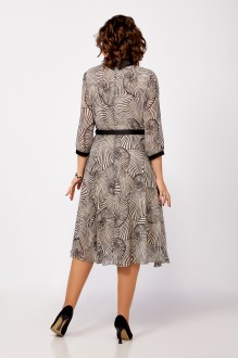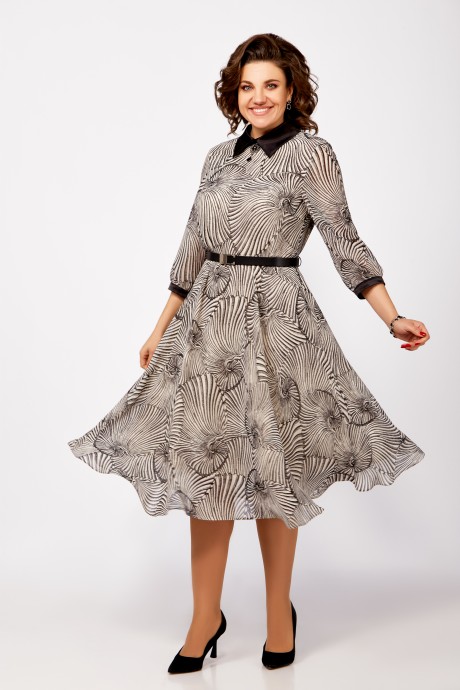 Платье из нежного шифона на трикотажной подкладке, отрезное по линии талии, длины миди. Лиф полуприлегающего силуэта. По полочке лифа нагрудные вытачки, по спинке средний шов и таллиевые вытачки. Юбка расклешенная. По горловине отложной воротник рубашечного типа из отделочной ткани. Рукав втачной одношовный длиной ¾, внизу со сборкой и манжетой из декоративной ткани. В среднем шве спинки застёжка на потайную тесьму-молнию, на стойке сзади две навесные петли и декоративные пуговицы. Платье украшено брошью и ремнём с декоративной пряжкой.