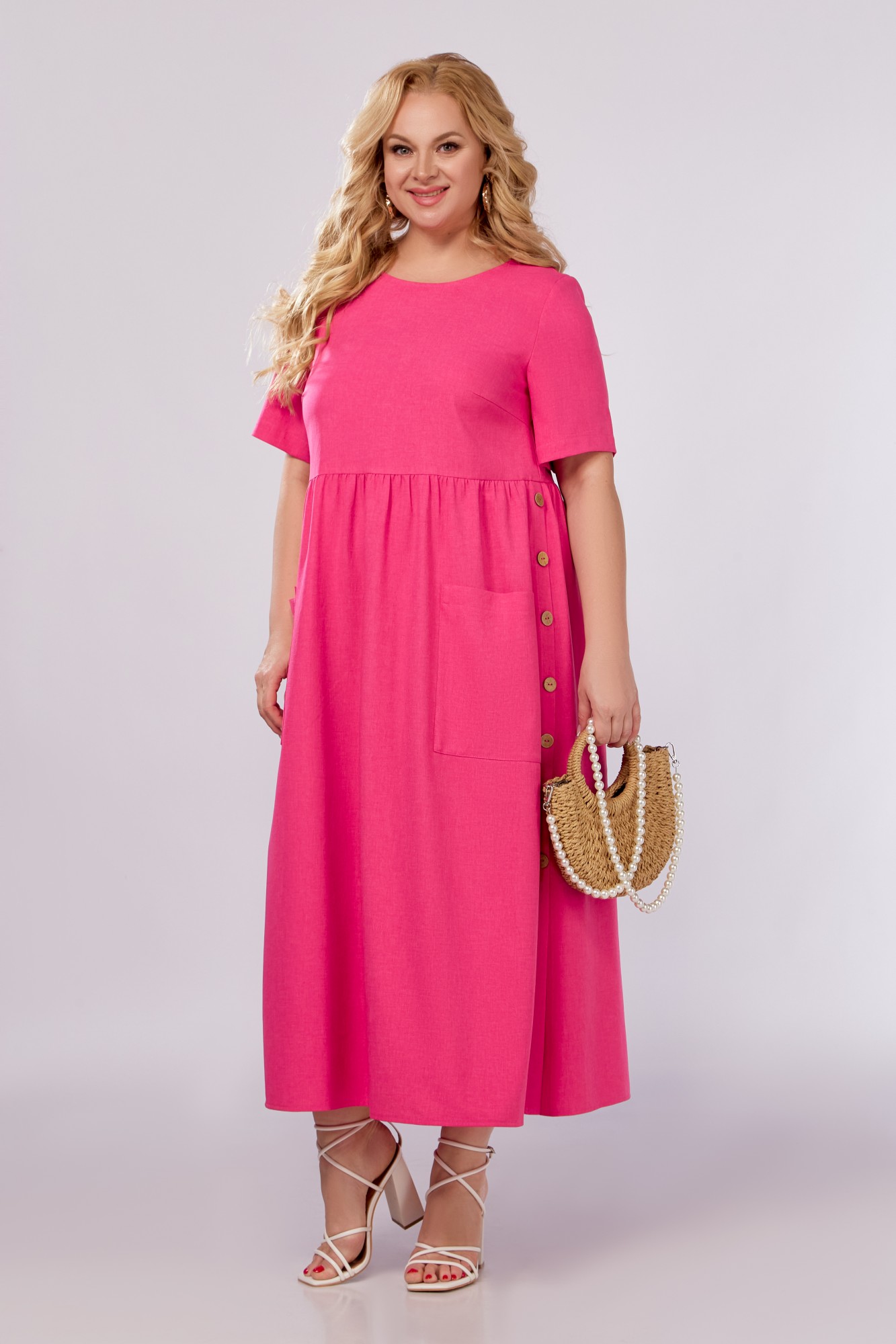 Платье из вискозно-льняной ткани прямого силуэта длиной миди. Платье с отрезной, слегка завышенной линией талии и сборкой по юбке. Лиф полочки с нагрудными выточками и округлым вырезом горловины, лиф спинки с центральным швом и V-образным вырезом горловины. Юбка состоит из передней и задней деталей с цельнокроеными планками по бокам, которые скреплены декоративными пуговицами. На передней детали юбки настрочены накладные карманы. Рукав втачной, короткий длиной – 28 см.