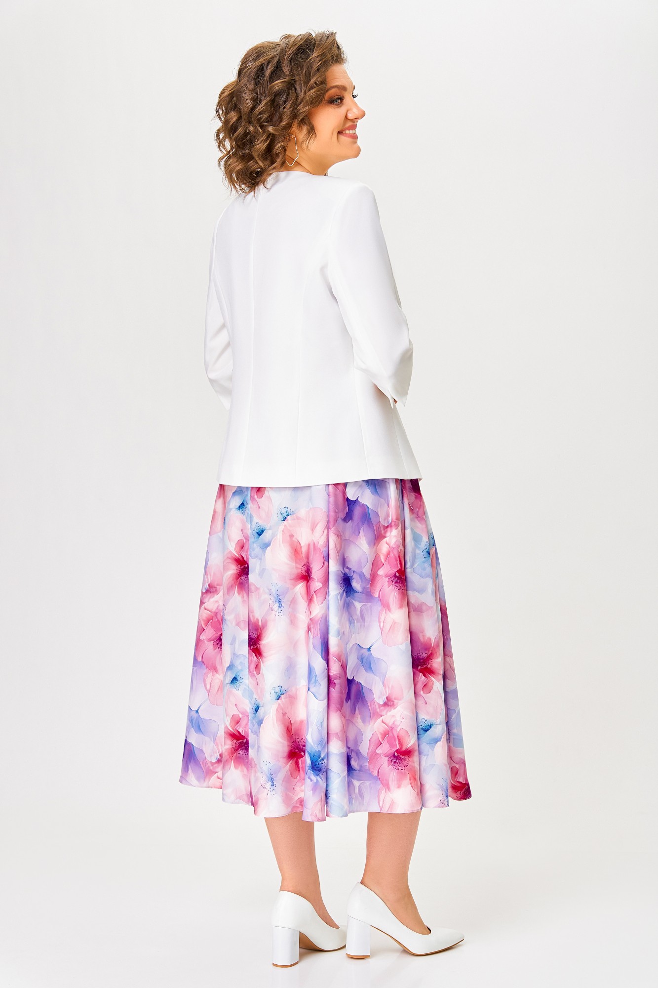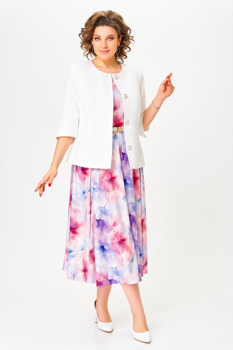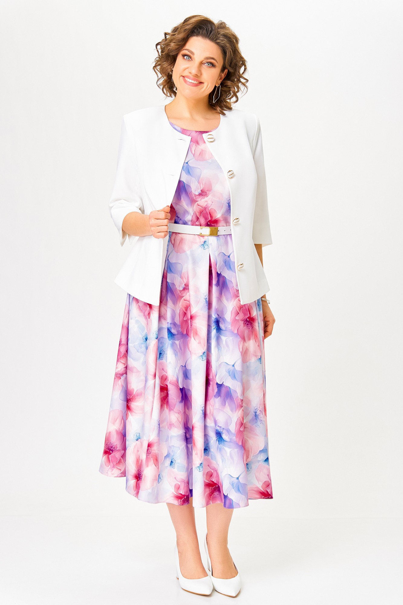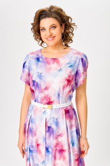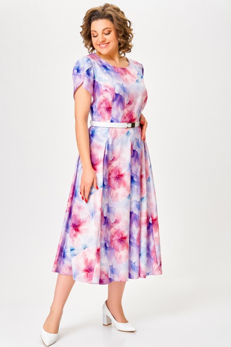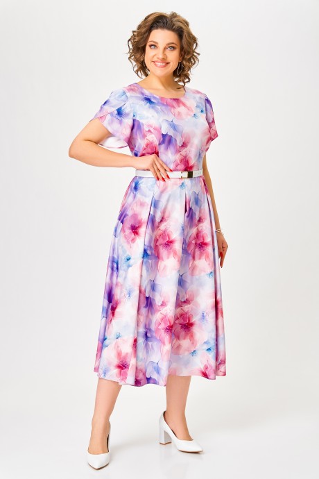 Платье женское из мягкой вискозной ткани, Х-образного силуэта с полуприлегающим лифом. Платье отрезное по линии талии. По переду лифа отрезные рельефы, по спинке таллиевые выточки. Юбка расклешённая из шести клиньев со встречными складками по линии талии. В среднем шве спинки застёжка на потайную тесьму-молнию. Рукав втачной покроя тюльпан, длина рукава 15 см. В подарок ремень с декоративной пряжкой. В размере 64 пояс из основной ткани. Прекрасно сочетается с жакетом Модель 523.