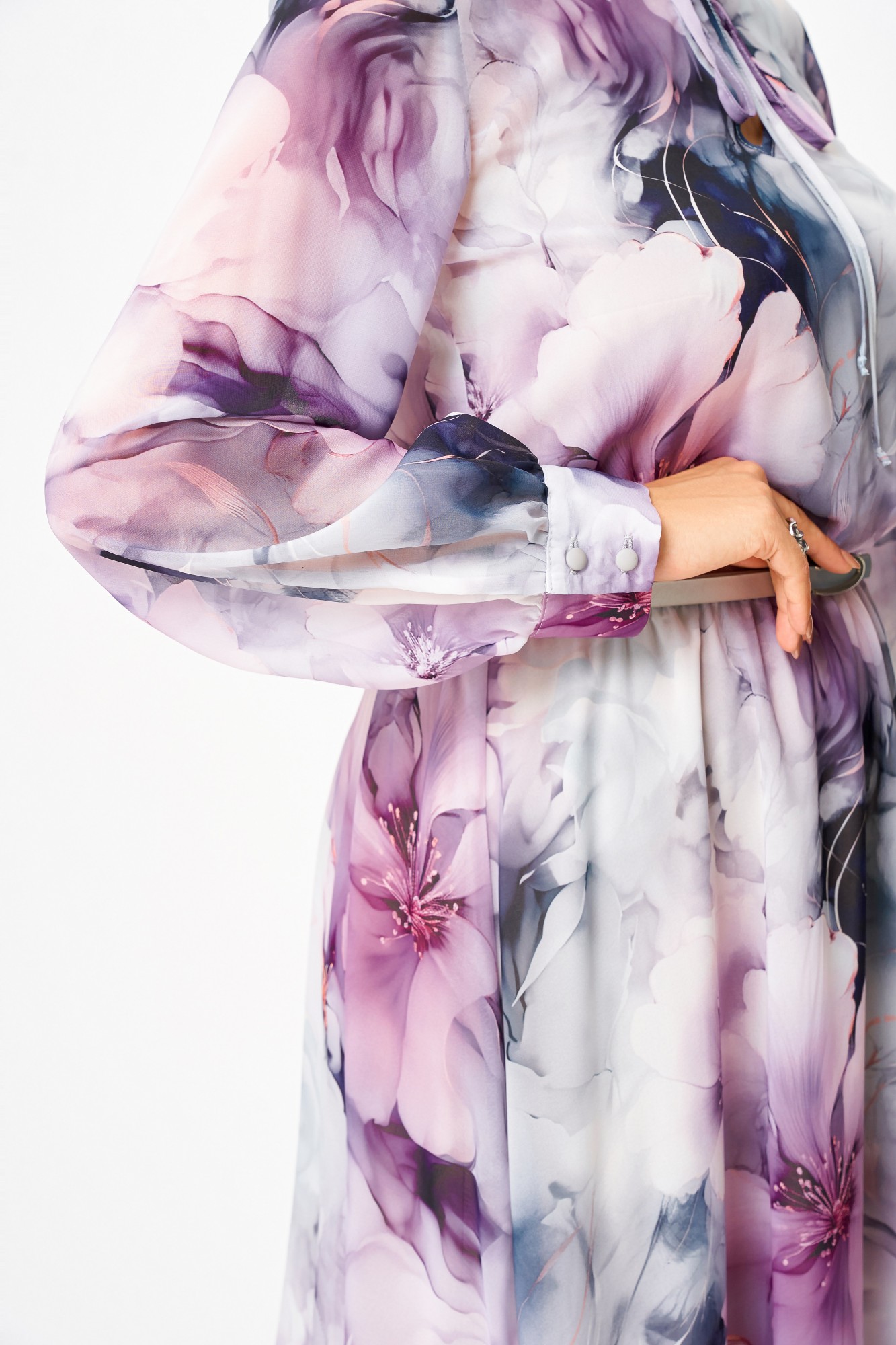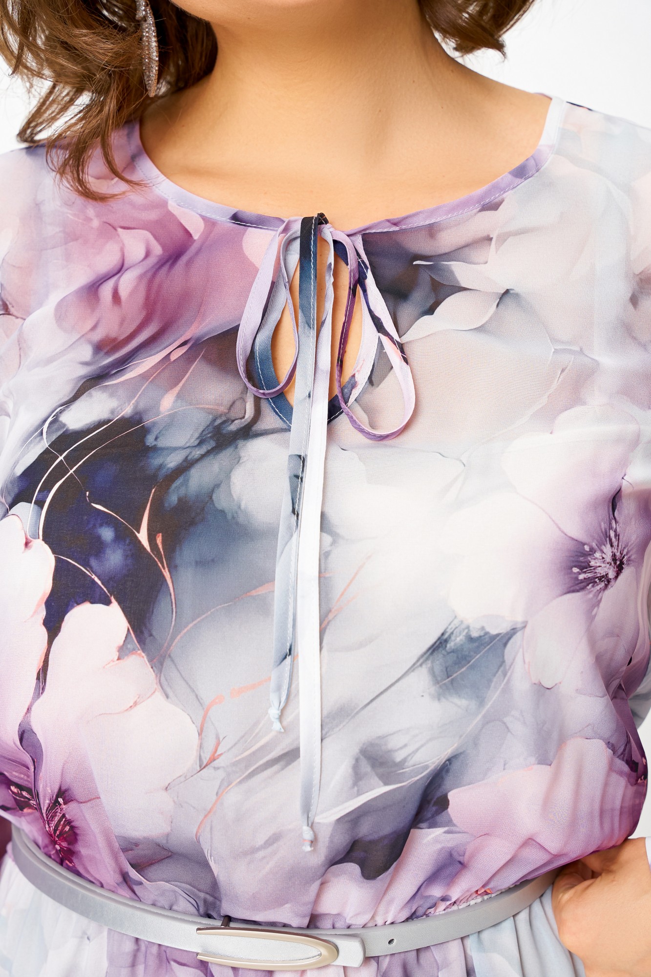 Платье из воздушной шифоновой ткани, на трикотажной подкладке, отрезное по линии талии, шов собран на эластичную тесьму-резинку. Горловина округлой формы, по переду капелька с завязкой. Рукав втачной одношовный, внизу со сборкой и манжетой, которая застёгивается на 2 петли и пуговицы. Юбка расклешённая. Подкладка лифа платья на бретелях. В подарок ремень с декоративной пряжкой.