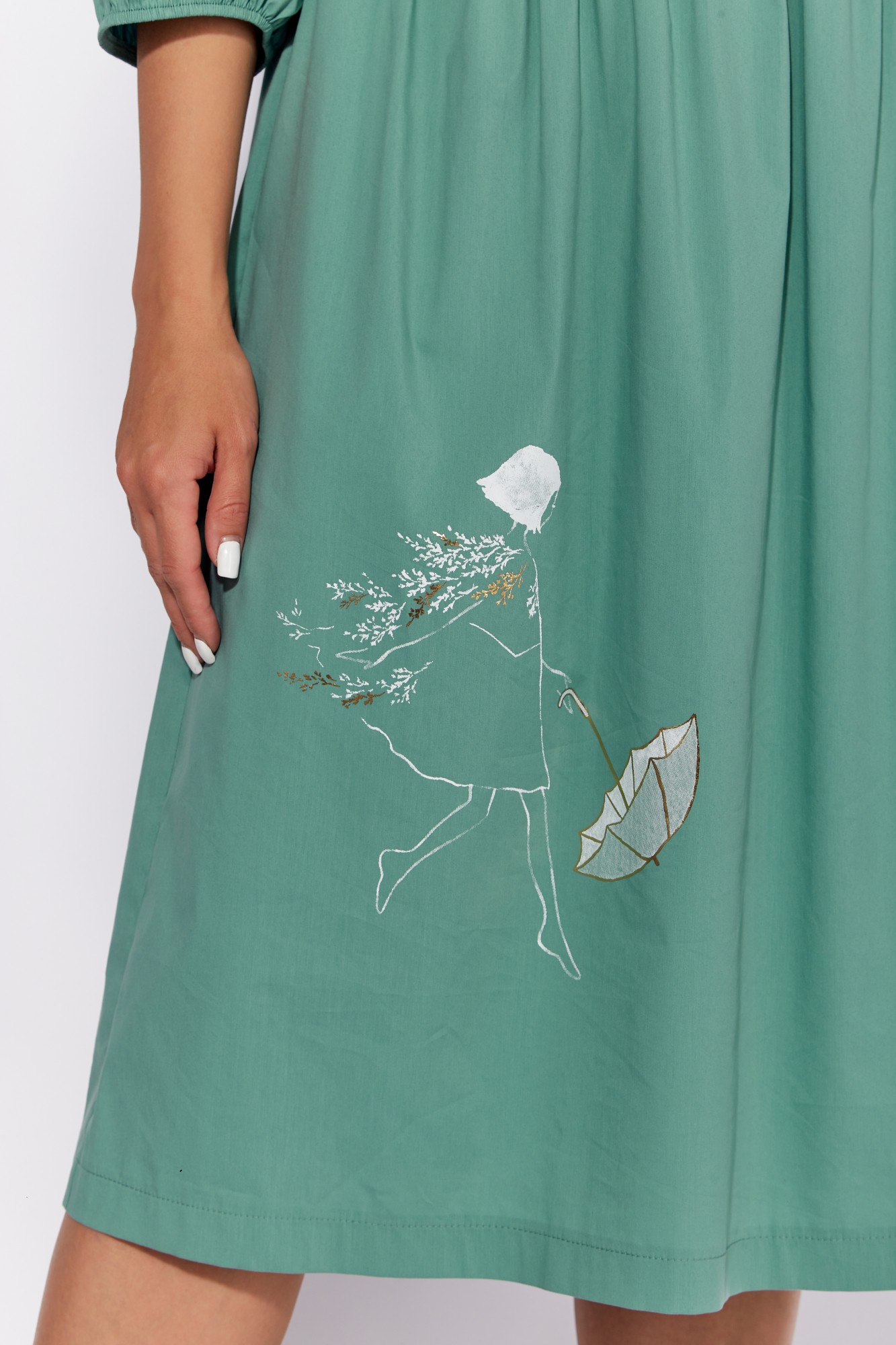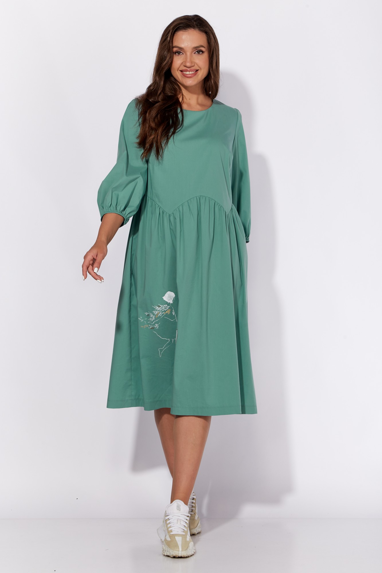 Платье женское, полуприлегающего силуэта, расширенное к низу. Рукав длиной 3/4, втачной. Низ рукава на резинке. Вырез горловины круглой формы. Низ лифа переда и спинки фигурной формы. Нижняя часть платья расширенная, со сборкой сверху, задекорирована принтом. Карманы в боковых швах.