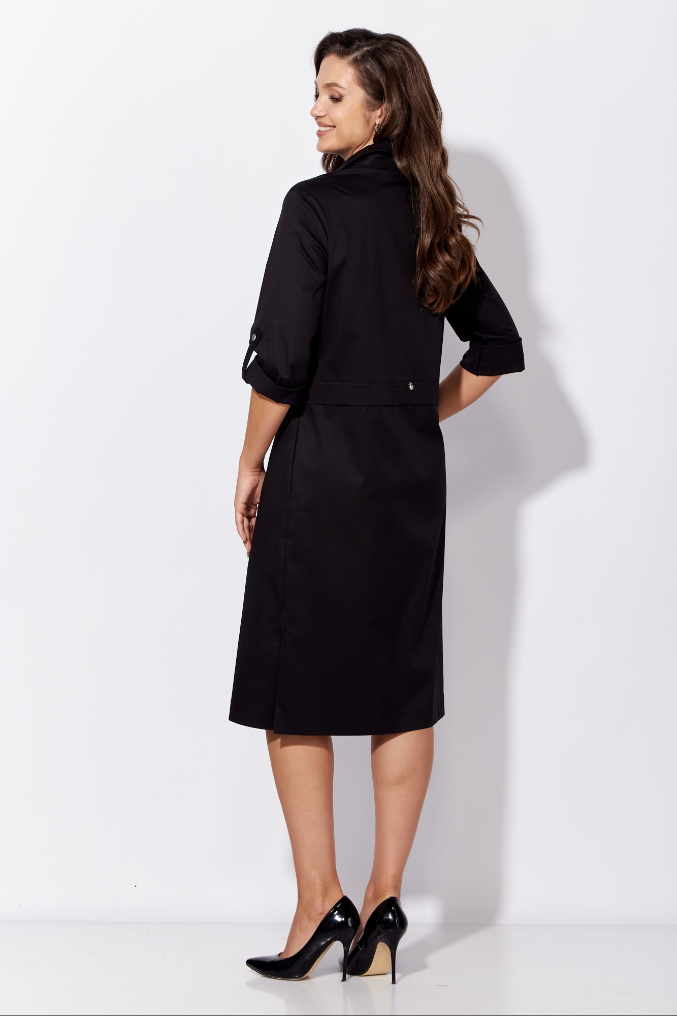 Платье женское, прямого силуэта, с рукавом длиной 7/8. Рукав рубашечный, с чуть спущенной линией плеча. По низу длина регулируется патой. Платье отрезное выше линии талии, с отлетной складкой. Лиф переда задекорирован вышивкой. Воротник рубашечного типа, на отрезной стойке. Застежка центральная, с планкой , на петли и пуговицы. По бокам, снизу, разрезы. По спинке, на отлетной складке, небольшой пришивной декор.