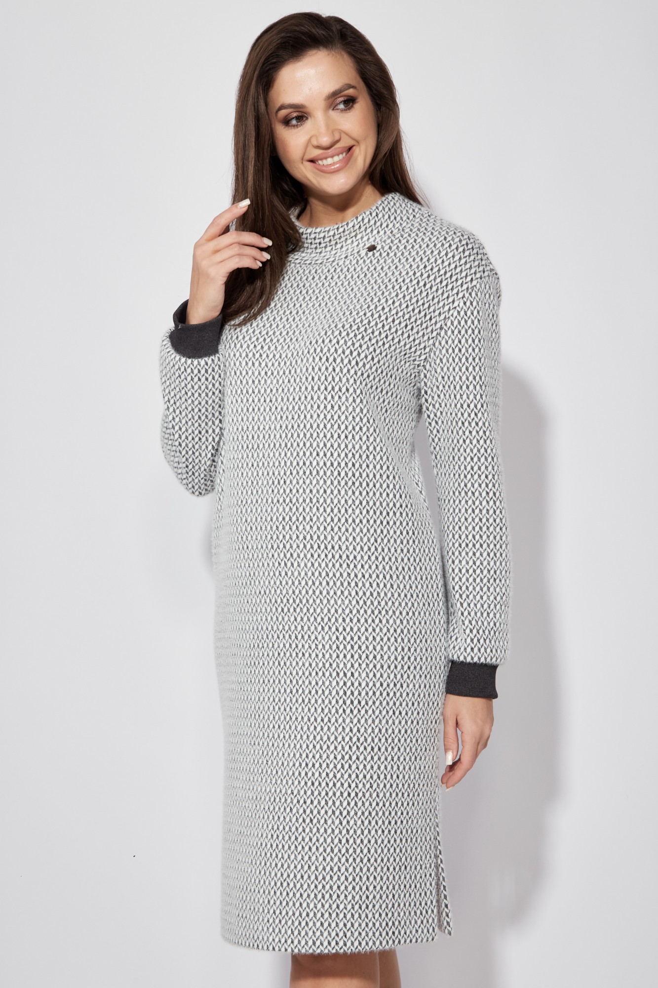 Платье женское, прямого силуэта с длинным рукавом. Рукав со спущенной линией плеча и притачной манжетой по низу. Горловина оформлена мягкой, отрезной полустойкой и акцентирована пришивным украшением. Снизу, по боковому шву небольшой разрез. Спинка без особенностей.